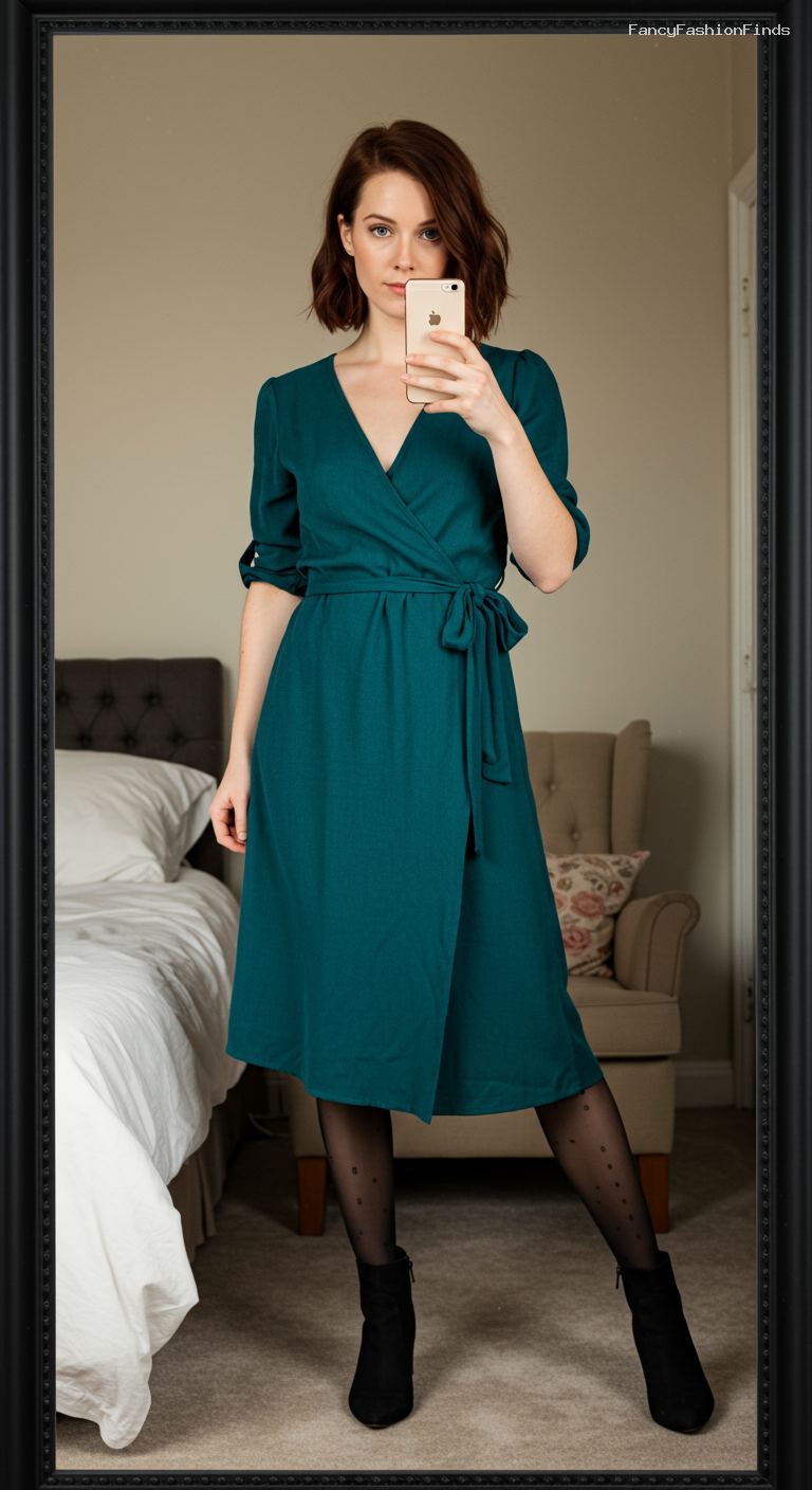 Perfect for a sophisticated office day or a chic evening gathering, this ensemble features a rich teal wrap dress that gracefully flatters many figures with its adjustable waist and V-neckline. The three-quarter sleeves add a polished touch, while the subtle polka dot tights introduce a playful texture and a contemporary edge. This versatile look is completed with sleek black ankle boots, offering both comfort and modern style, making it ideal for those seeking a blend of professionalism and subtle flair.