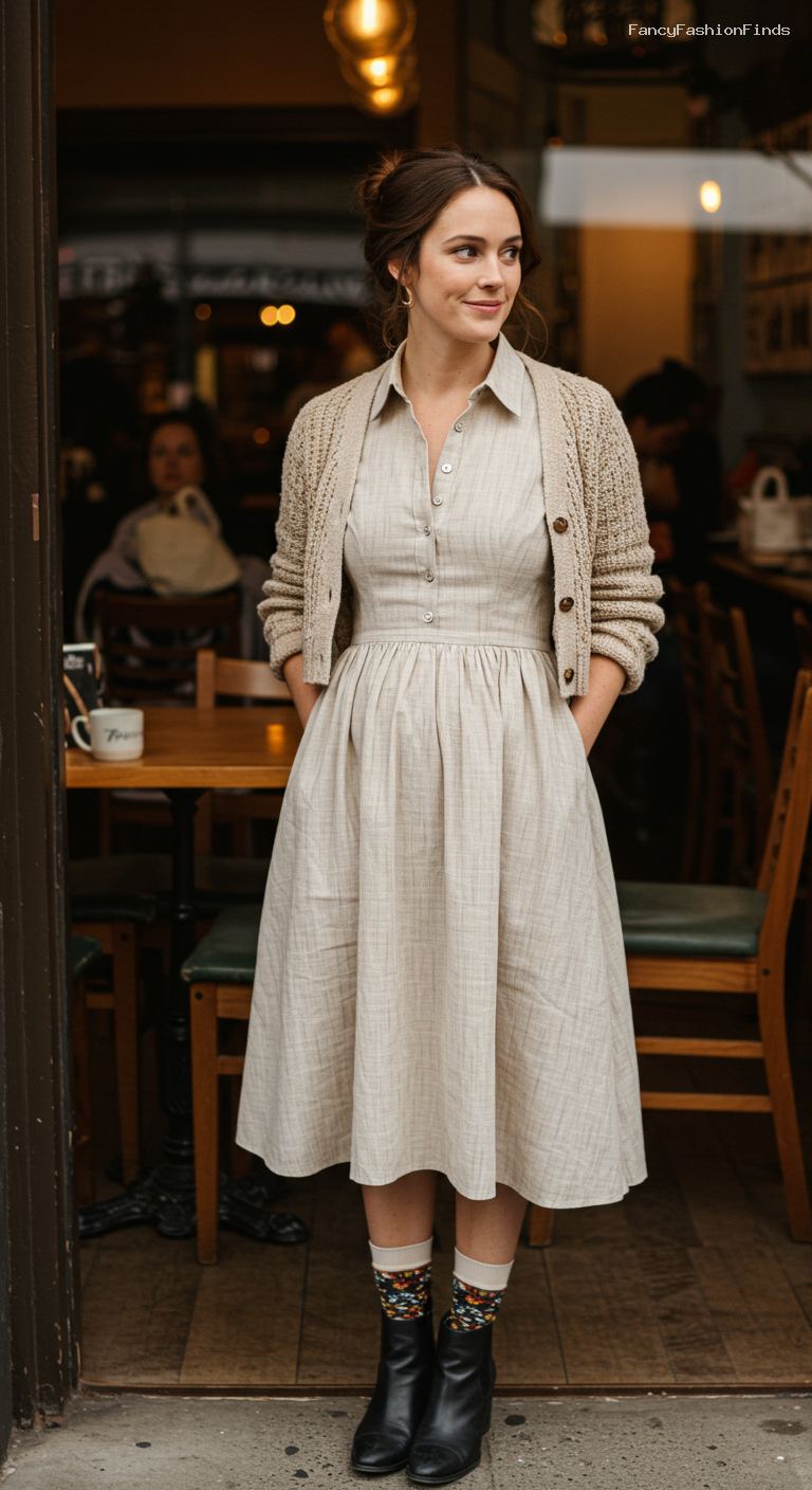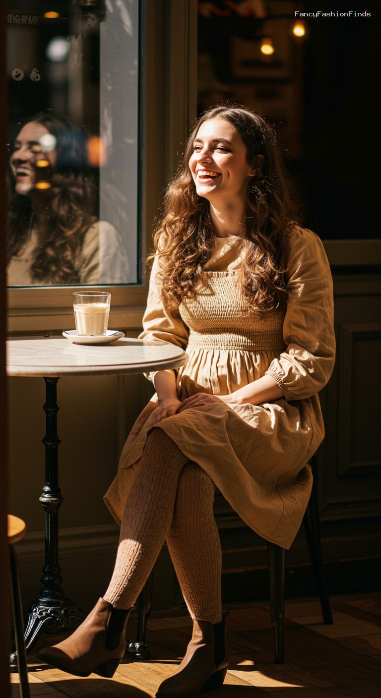 Perfect for a relaxed brunch or a casual afternoon at a coffee shop, this outfit blends comfort with understated style. The smocked bodice midi dress in a warm, neutral tone offers a flattering silhouette, especially for those with an hourglass or pear body shape, while its long sleeves provide coverage and elegance. Paired with cable-knit tights and rich brown ankle boots, the ensemble creates a harmonious, textured look that is both inviting and effortlessly put-together. This outfit is ideal for women seeking a blend of feminine charm and practical warmth for transitional seasons.