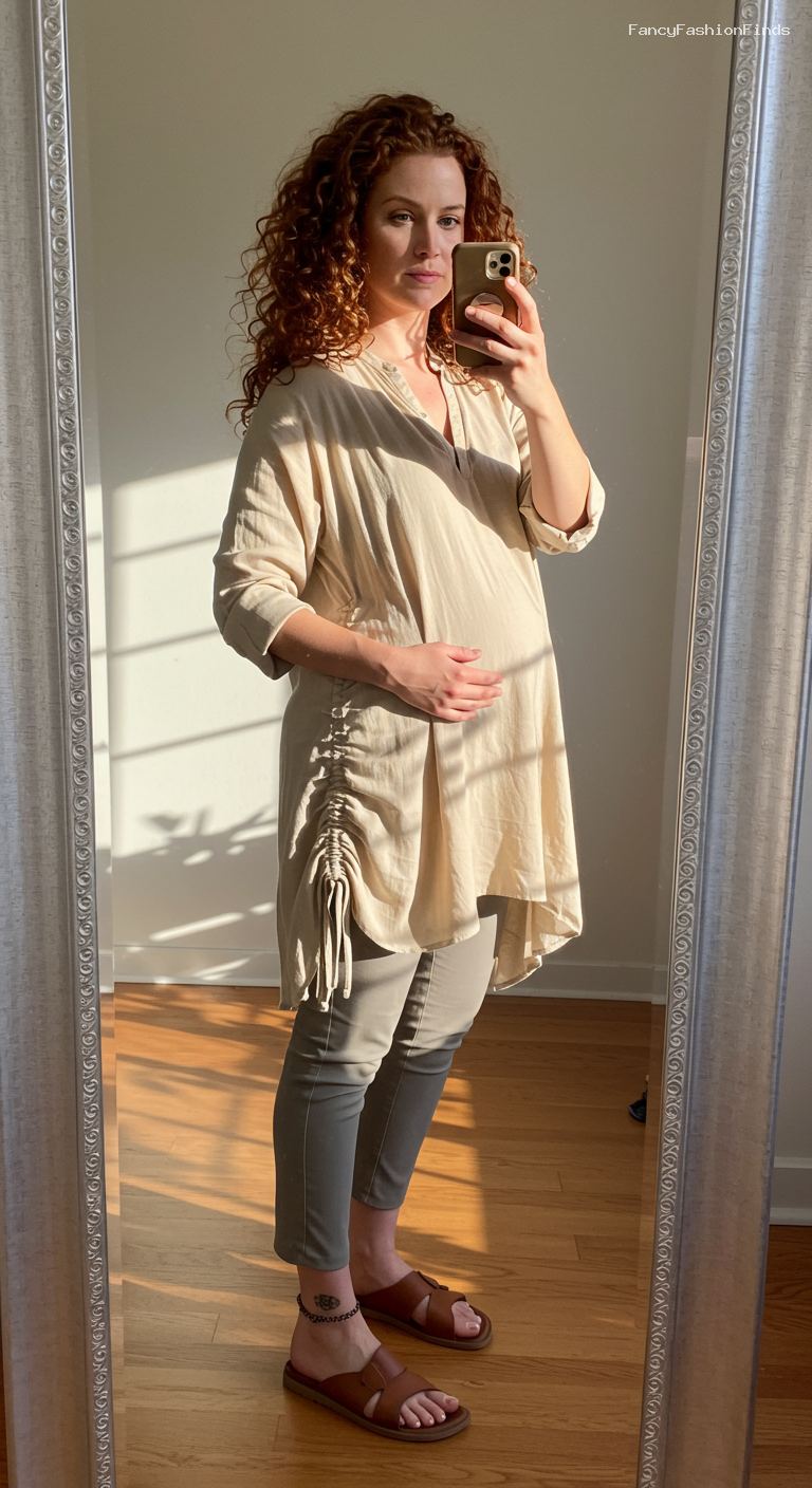The serene interplay of creamy beige and muted olive creates a grounded, approachable aesthetic. A relaxed-fit tunic, featuring artful side ruching, pairs seamlessly with slim-cut capri pants, offering both comfort and modern lines. This versatile ensemble is ideal for those who appreciate understated elegance and can transition effortlessly from a casual daytime outing to a relaxed evening gathering, particularly flattering for an apple or pear body shape due to its flowing top and tapered bottom.