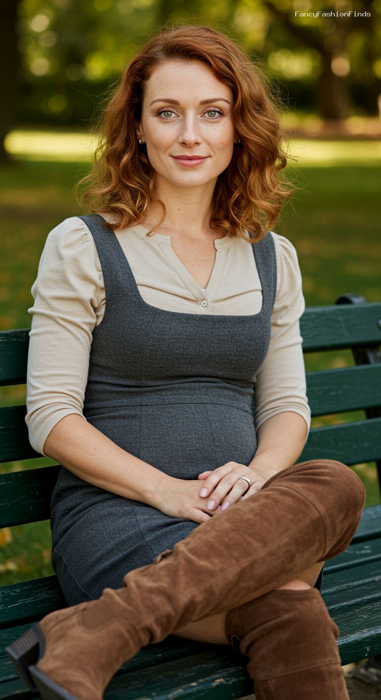 The rich, over-the-knee suede boots in a warm brown hue immediately draw the eye, grounding this sophisticated autumn ensemble. A charcoal grey pinafore dress, featuring a flattering square neckline, layers elegantly over a light beige long-sleeved top with delicate puffed shoulders. This combination creates a harmonious balance of texture and color, suitable for various body types, particularly those seeking comfortable yet polished style. It’s an ideal outfit for a casual day out, a relaxed brunch, or a leisurely stroll through a park.