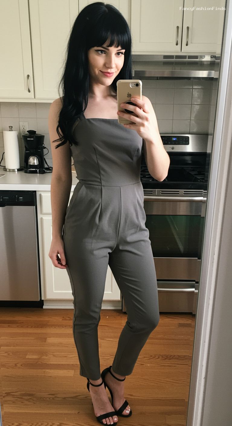 The seamless construction of this charcoal gray jumpsuit creates a polished, elongated silhouette, making it an effortlessly chic choice. Its structured square neckline and tailored trousers offer a sophisticated yet comfortable aesthetic, ideal for those who appreciate minimalist design. This versatile one-piece, paired with simple black ankle-strap heels, is perfect for a business-casual office environment, a relaxed dinner, or an evening event, complementing various body types with its clean lines and defined waist. The understated elegance of the ensemble allows for easy accessorizing to transition between different settings.