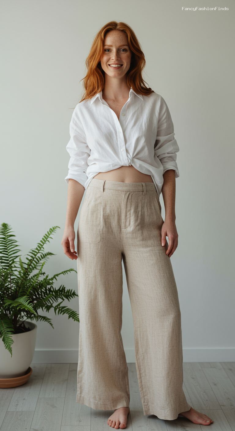 The color story of crisp white and natural beige creates an effortlessly chic and comfortable aesthetic. A loosely tied white button-down shirt paired with wide-leg linen trousers offers a breathable and relaxed silhouette. This combination is ideal for various body types, particularly those seeking a comfortable yet polished everyday style, and is perfect for casual outings, warm-weather events, or a relaxed work-from-home look.