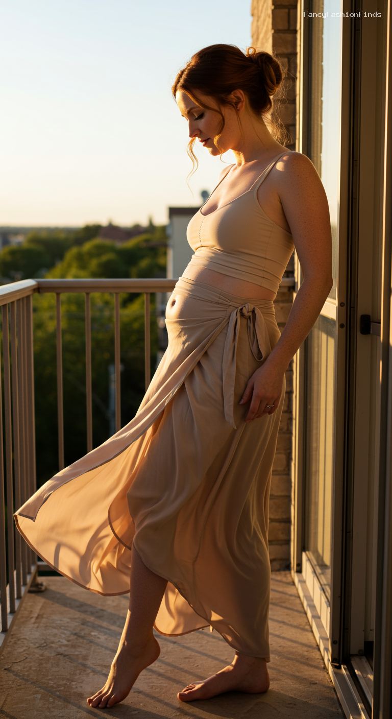 The smooth, flowing fabric of this two-piece set creates a relaxed yet sophisticated silhouette, perfect for warm-weather ease. A fitted camisole top paired with a coordinating wrap skirt offers versatility and comfort, highlighting the natural curves without restriction. This outfit is ideal for those with a feminine, relaxed personal style and can flatter various body types, particularly those seeking comfort and elegance. It’s perfectly suited for casual daytime events, resort wear, or a relaxed evening out, especially during golden hour.