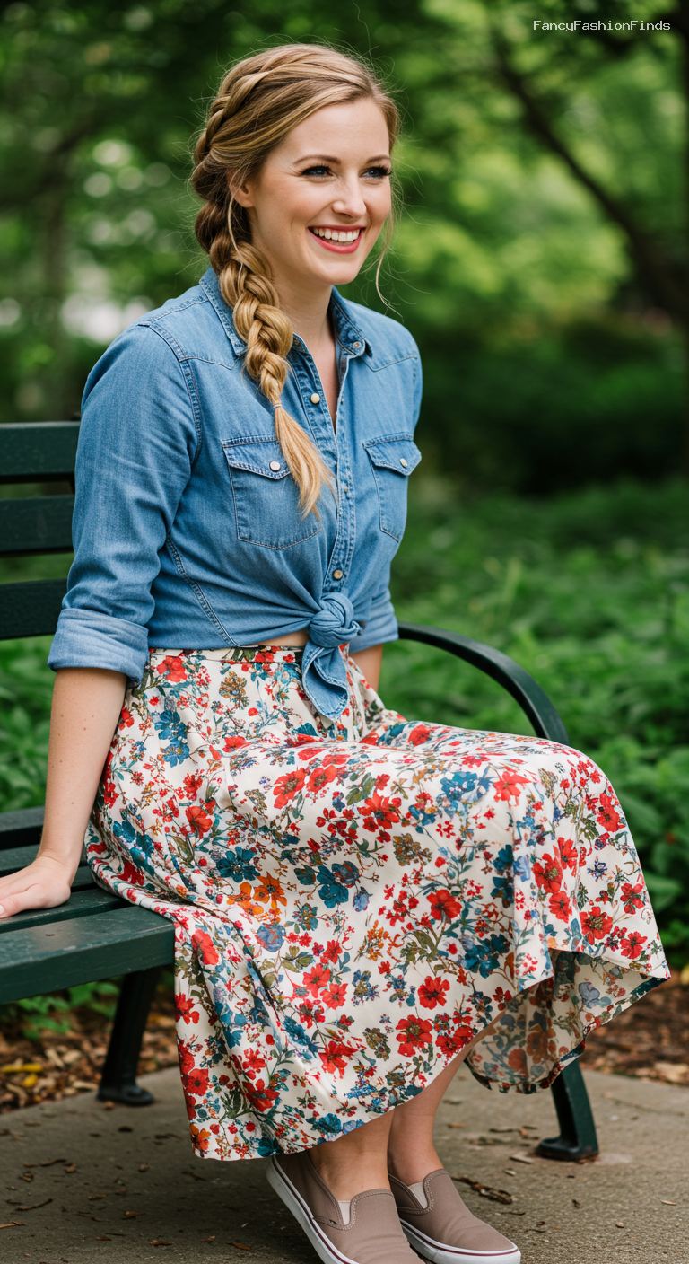 By knotting a classic denim shirt at the waist, a relaxed yet defined silhouette is created, perfectly balancing a flowing floral midi skirt. The crisp blue of the chambray top harmonizes beautifully with the vibrant red and blue blooms on the ivory skirt, offering a fresh, approachable aesthetic. This pairing works exceptionally well for those who appreciate comfort without sacrificing feminine charm, complementing various body types by highlighting the natural waist. It’s an ideal ensemble for casual daytime outings, park strolls, or relaxed weekend gatherings.