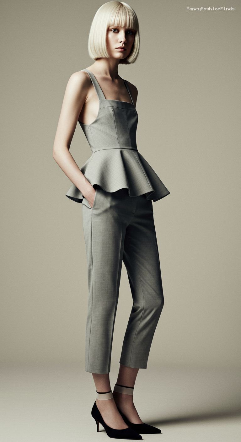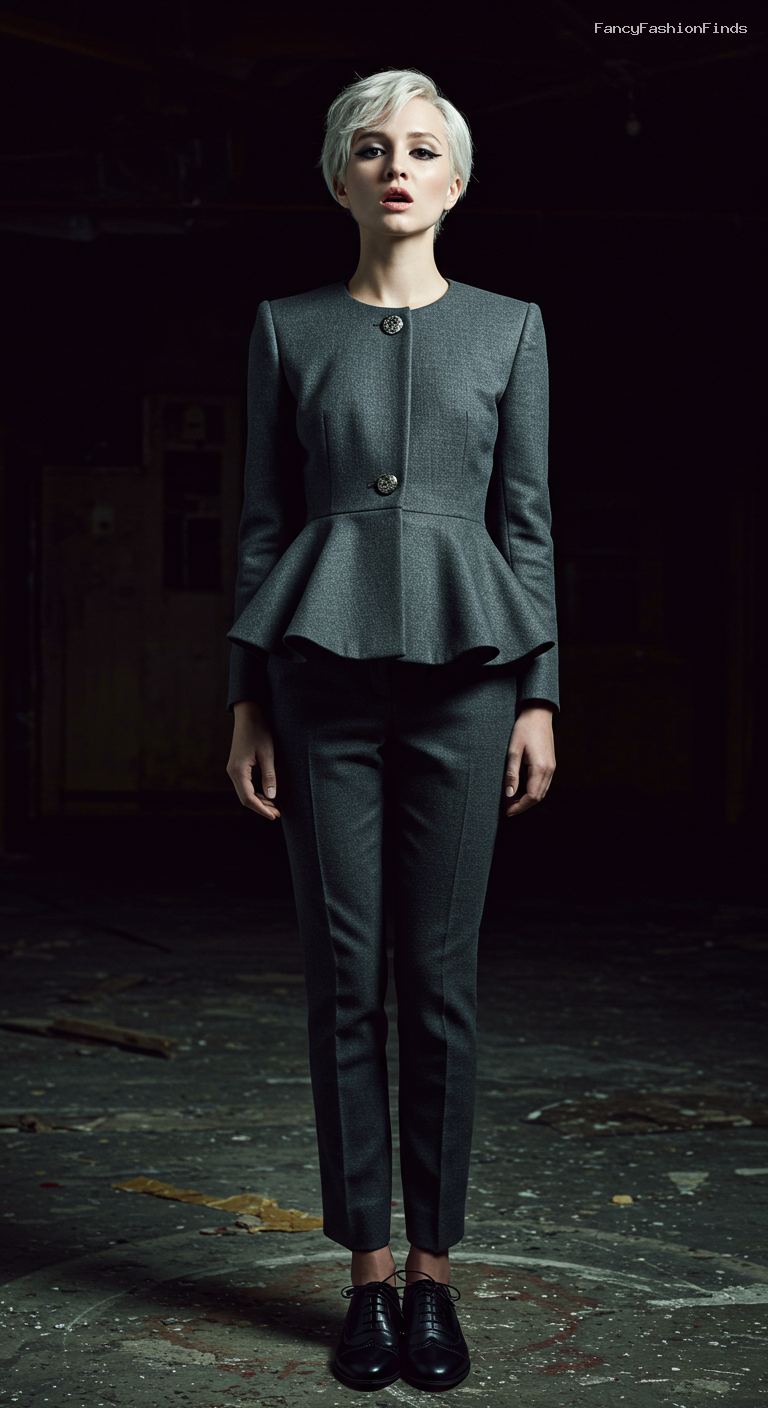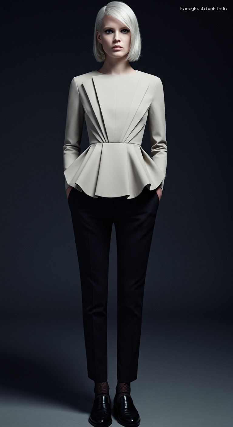 Perfect for a sophisticated evening event or a high-stakes business meeting, this ensemble exudes contemporary elegance. The structured peplum top, featuring intricate pleating in a serene greige hue, creates a dramatic silhouette that accentuates the waist. Paired with tailored black trousers, the outfit offers a balanced and polished look, ideal for those who appreciate modern design and a refined aesthetic. This combination beautifully complements hourglass and pear body types, providing both structure and graceful movement.