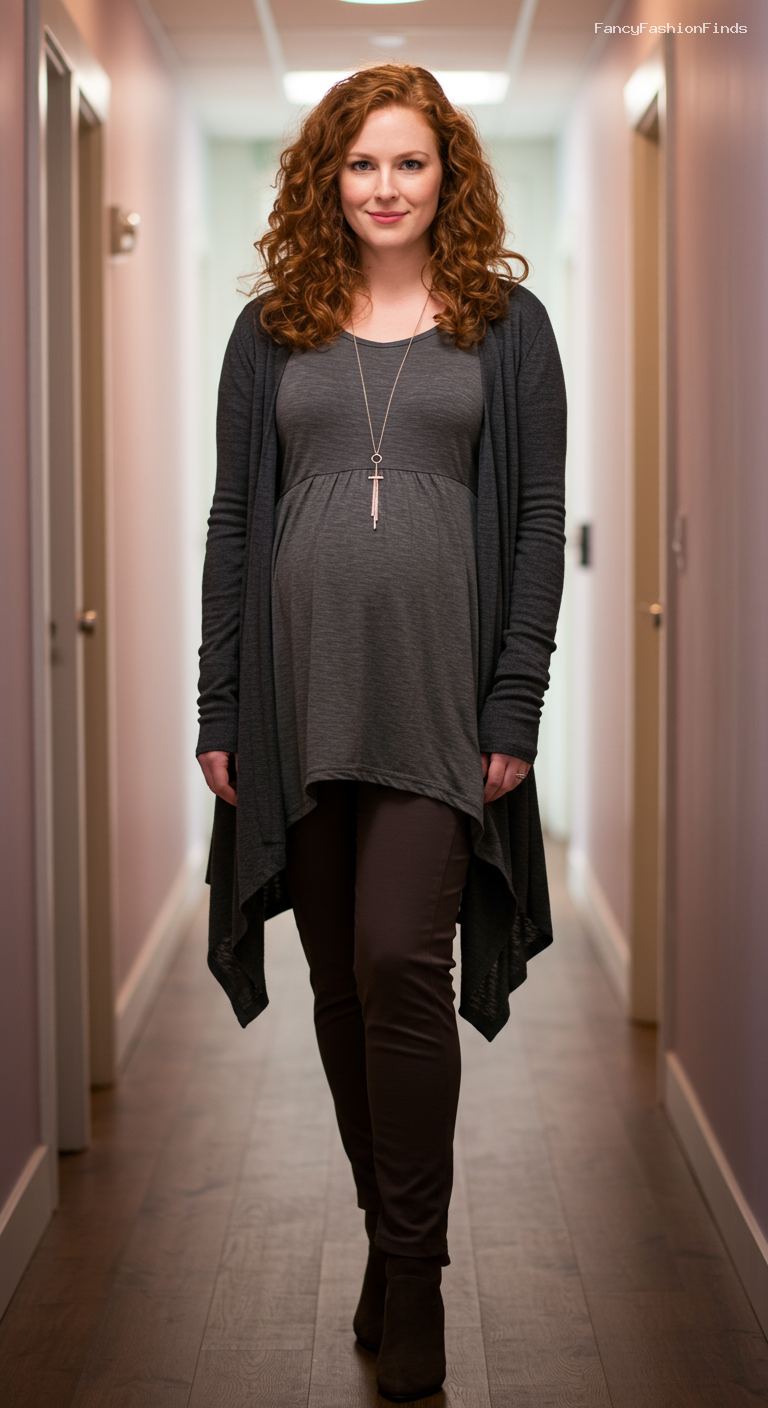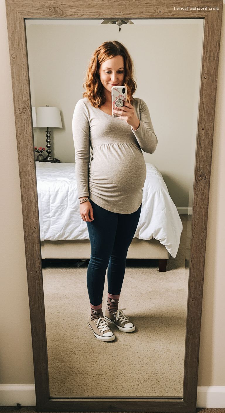 A harmonious blend of soft grays and deep blues defines this effortlessly comfortable ensemble, ideal for everyday wear. The long-sleeved, ruched maternity top in a muted gray offers gentle support and a relaxed fit, pairing perfectly with slim-fit navy jeans. This outfit provides practical elegance for expectant mothers seeking both style and ease, suitable for running errands or casual outings. The combination works well for various body types, emphasizing comfort while maintaining a put-together aesthetic.