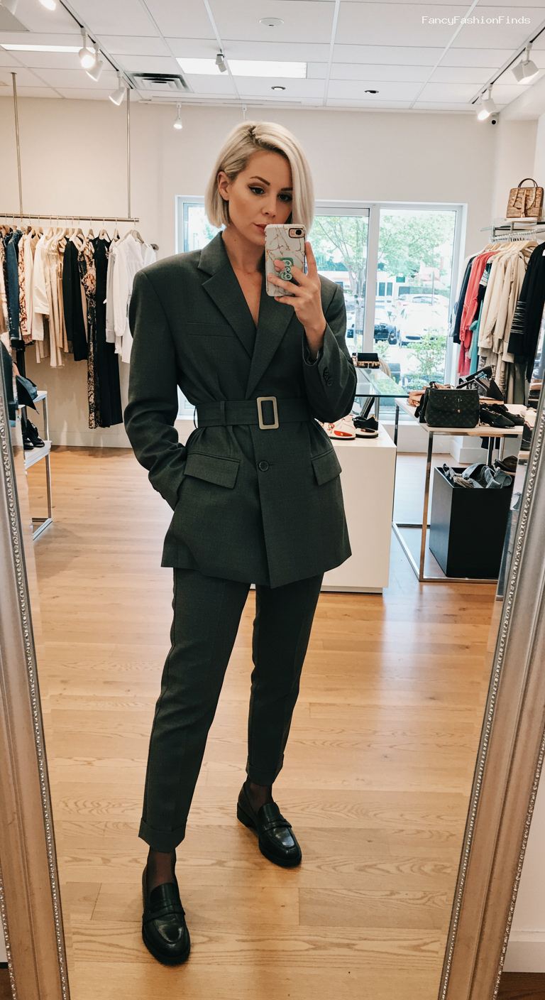 Exuding confident sophistication, this monochromatic dark olive suit offers a sleek, contemporary take on business attire. The belted blazer cinches the waist, creating an hourglass silhouette, while the tapered trousers provide a polished finish. This ensemble is ideal for professional women who appreciate a powerful yet refined aesthetic and works beautifully for formal meetings, presentations, or upscale networking events.