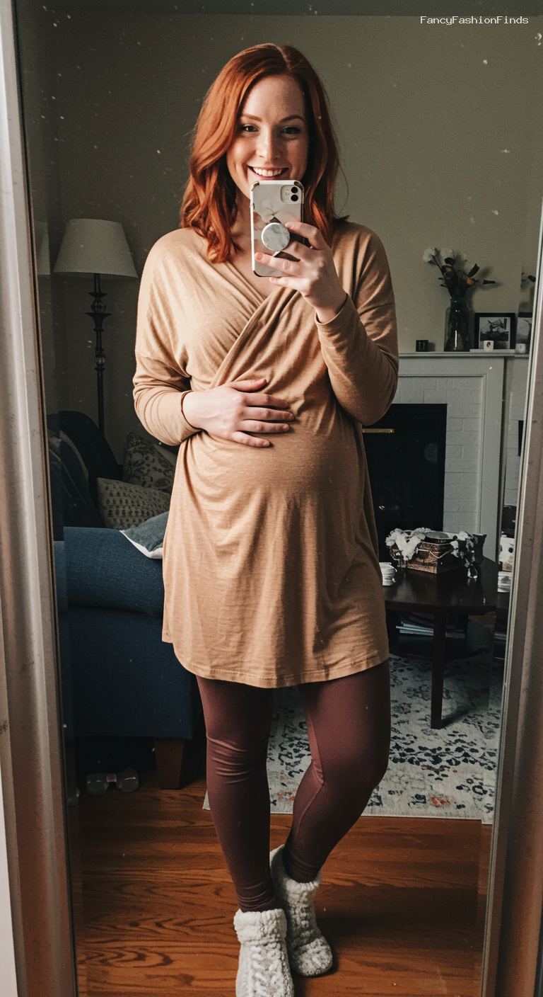 The distinctive crossover detail of the soft tan tunic provides both visual interest and a comfortable, relaxed fit, making it ideal for various body types seeking both style and ease. Paired with deep maroon leggings, the color combination offers a warm and inviting aesthetic perfect for casual outings or a cozy day at home. This ensemble exudes effortless comfort, suitable for individuals who prioritize relaxed yet chic dressing during cooler seasons.