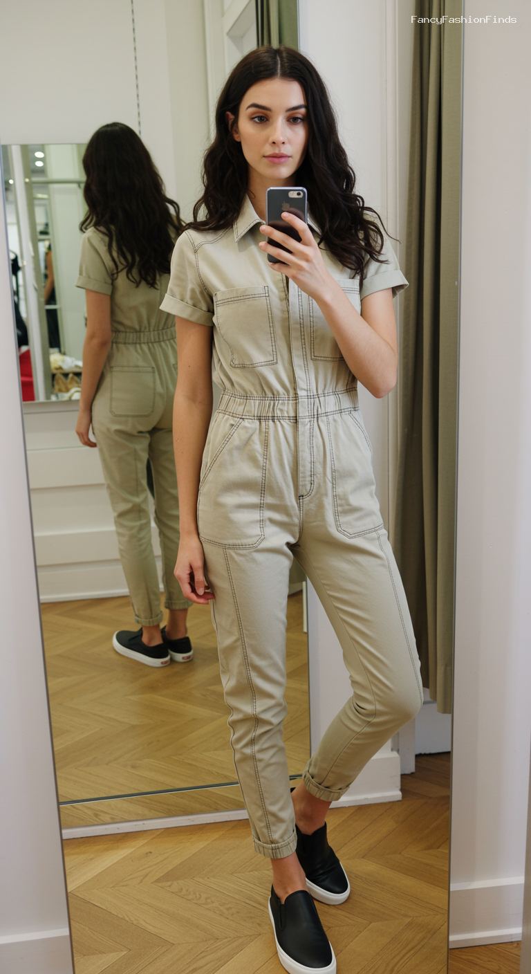The cohesive design of this utility jumpsuit creates a streamlined silhouette, making it an effortlessly stylish choice. Its neutral beige tone with contrasting dark stitching offers a subtle visual interest, while the elasticated waist and cuffed short sleeves provide a relaxed yet structured feel. This versatile one-piece would flatter various body types and is ideal for women seeking a casual yet polished aesthetic for daytime outings, errands, or relaxed social gatherings. Paired with simple black slip-on sneakers, it embodies comfortable, modern minimalism.