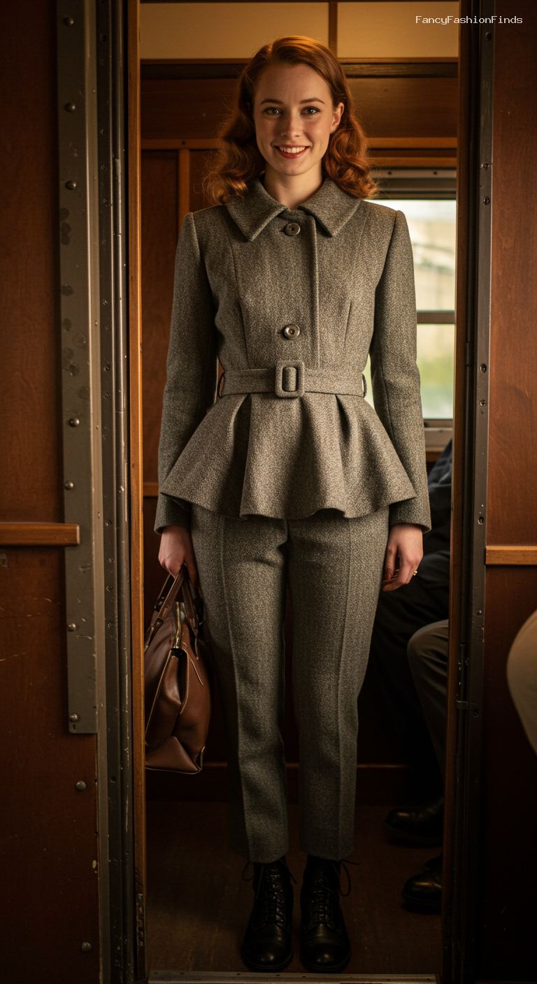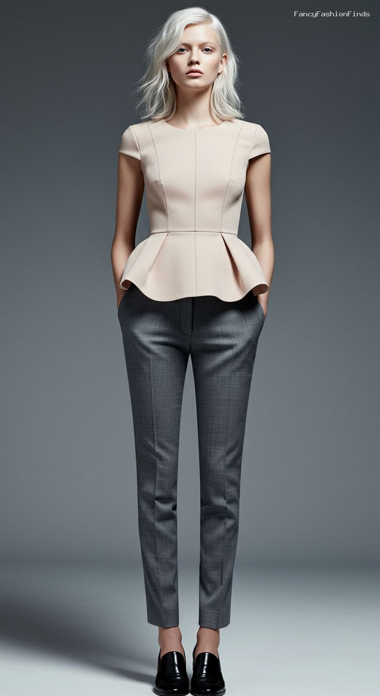 The smooth, structured fabric of the blush peplum top creates a sophisticated silhouette, perfectly balancing the tailored grey trousers. This pairing offers a refined aesthetic ideal for the modern professional. The peplum detail gracefully accentuates the waist, making it flattering for various body types, particularly those seeking to define their midsection or add subtle volume to the hips. This ensemble is well-suited for office environments, business meetings, or any occasion requiring polished, understated elegance.