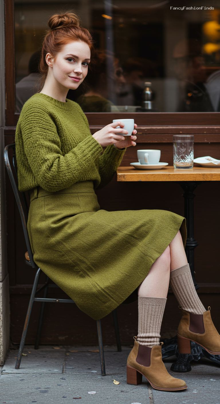 The unique element of this ensemble lies in its cohesive monochromatic color story, utilizing varying shades and textures of olive green for a sophisticated, unified effect. A cozy, ribbed knit sweater pairs harmoniously with a structured A-line skirt, creating an appealing silhouette that flatters many body types. Tan Chelsea boots, worn with complementary ribbed socks, introduce a subtle contrast while maintaining the outfit’s autumnal warmth. This chic and comfortable look is ideal for casual outings, coffee dates, or a relaxed day at the office during cooler seasons.