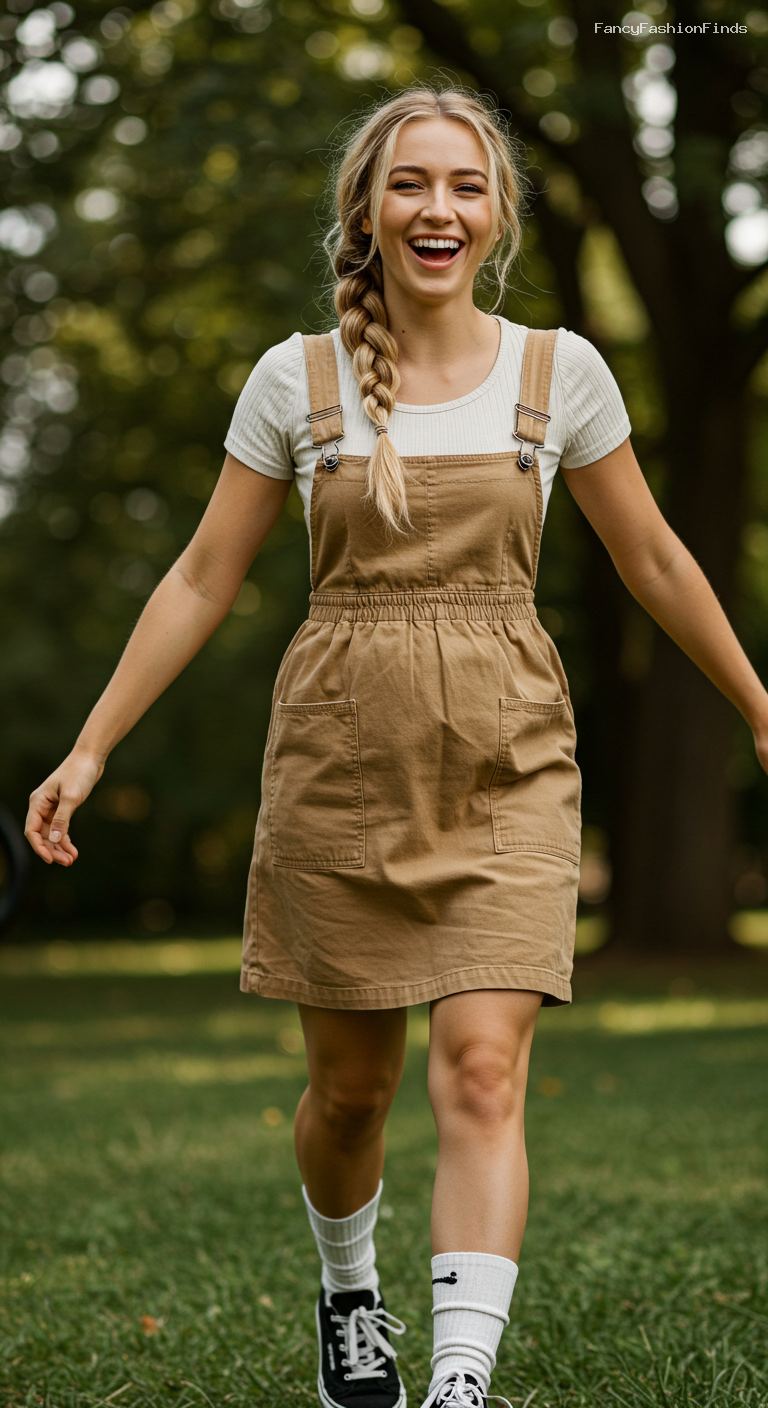Layering a crisp white ribbed tee under a classic khaki overall dress creates an effortlessly charming and relaxed aesthetic. The earthy tone of the overall dress, paired with the simple white top, offers a fresh, approachable feel that suits various casual outings. This versatile combination is ideal for a relaxed weekend, a park stroll, or even a creative workspace, offering comfort without sacrificing style for those who appreciate an easygoing yet put-together look. It particularly complements a youthful, free-spirited personal style and can flatter many body types due to its forgiving silhouette.
