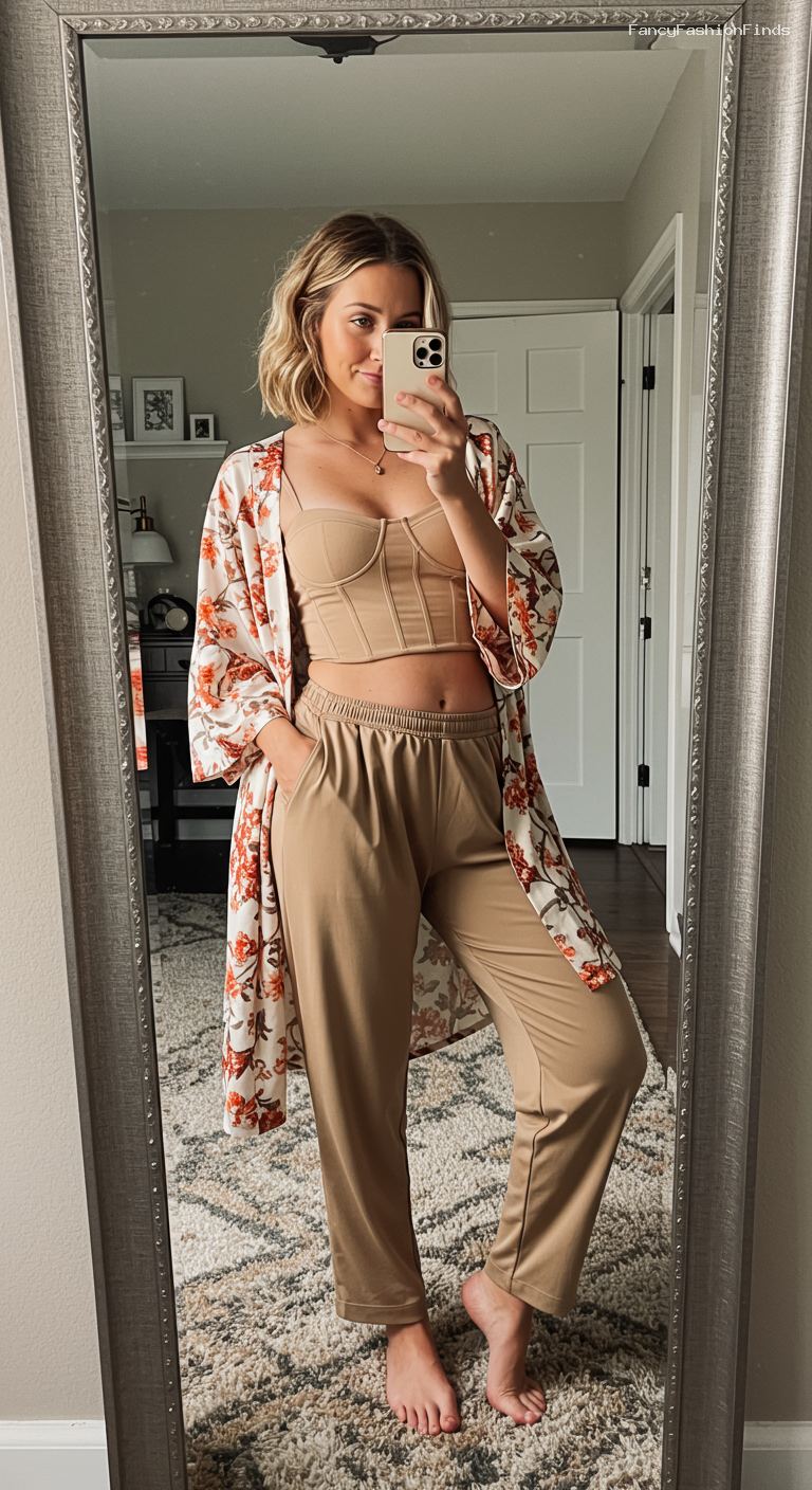 Inspired by a relaxed, resort-wear aesthetic, this outfit creates a cohesive and effortlessly stylish statement. The core of the ensemble features a neutral-toned bustier top paired with matching high-waisted, wide-leg trousers, offering both comfort and an elongated silhouette. A vibrant floral kimono draped over the shoulders introduces a playful contrast and a touch of bohemian flair, making it suitable for various body types and those who appreciate a blend of comfort and elegance. This versatile pairing is perfect for casual outings, relaxed brunch dates, or even as a chic travel outfit.