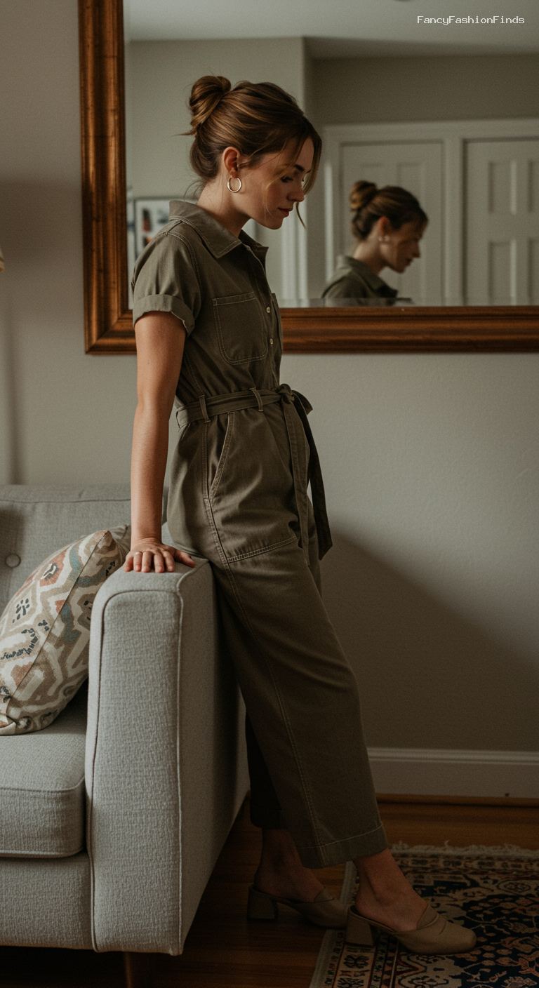 The crisp cotton twill fabric of this olive-green jumpsuit offers both structure and comfort, perfect for an effortlessly put-together aesthetic. Its relaxed fit with a defined waist, cinched by a self-tie belt, flatters various body types by creating an hourglass silhouette while allowing ease of movement. This versatile piece, complemented by short sleeves and a classic collar, is ideal for a casual brunch, a creative workspace, or an afternoon of errands, appealing to those who appreciate functional fashion with a refined edge. The neutral mules add to its understated sophistication, making it a go-to for a polished yet comfortable look.