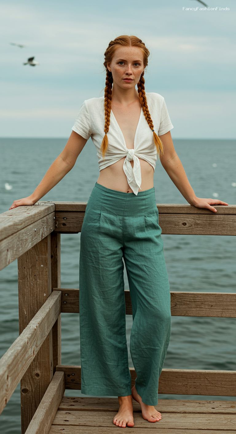 Perfect for warm weather, this ensemble offers breathable comfort without sacrificing style. The off-white sleeveless wrap top creates an adjustable silhouette, complementing various body types by highlighting the waist. Paired with high-waisted, wide-leg linen trousers in a sandy beige, this outfit provides a relaxed yet polished aesthetic. It’s an ideal choice for casual outings, beach vacations, or relaxed weekend brunches, appealing to those who favor a natural and comfortable personal style.