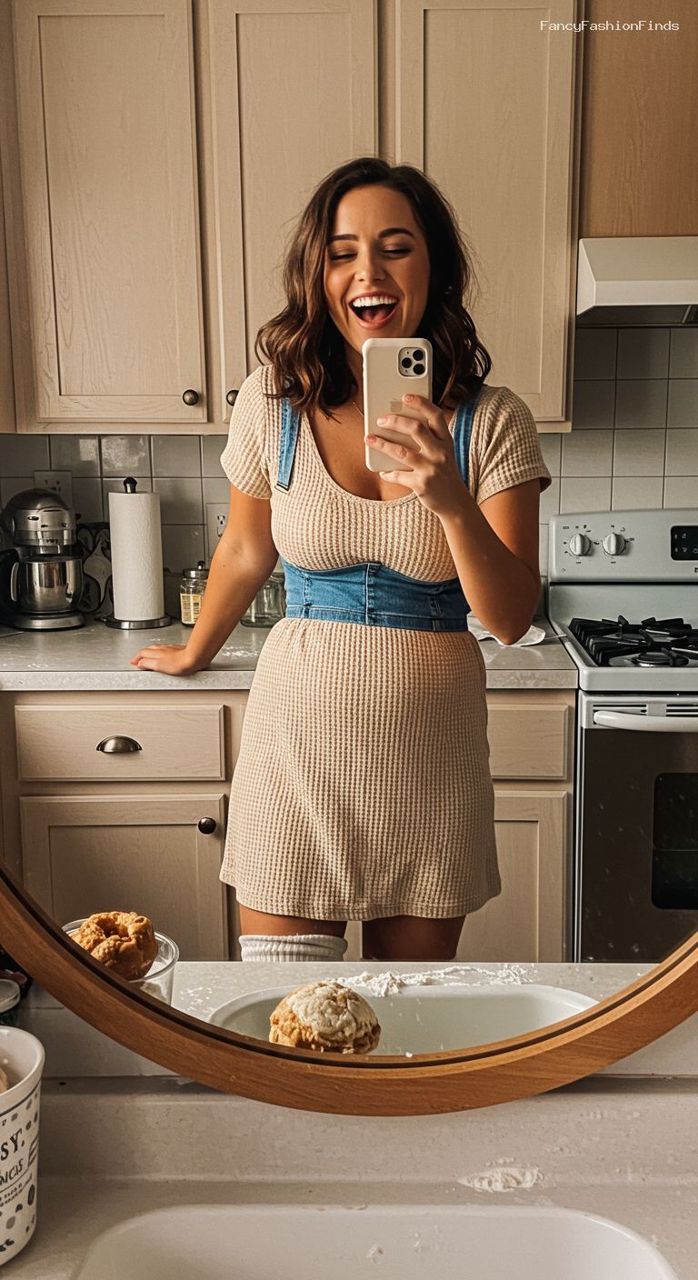 The color story of soft beige and classic denim blue creates a relaxed yet put-together aesthetic. A ribbed knit bodycon dress in a warm neutral hue offers comfortable contouring, perfectly complemented by a light wash denim shirt worn open for an effortless layer. This versatile combination suits various body types, particularly those seeking comfort without sacrificing style, and works wonderfully for casual outings, weekend errands, or relaxed social gatherings where ease is key.
