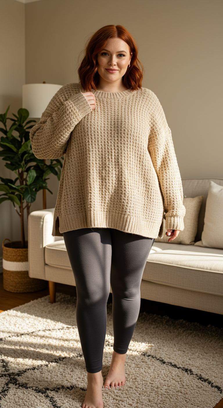 The tactile waffle-knit of the oversized beige sweater creates a wonderfully inviting and relaxed aesthetic, perfect for everyday comfort. Its generous fit and side slits offer ease of movement and a flattering drape over the contrasting dark grey leggings. This simple yet effective pairing is ideal for those who prioritize both coziness and casual elegance, suiting various body types with its forgiving silhouette. An excellent choice for a leisurely weekend, working from home, or a casual coffee outing.