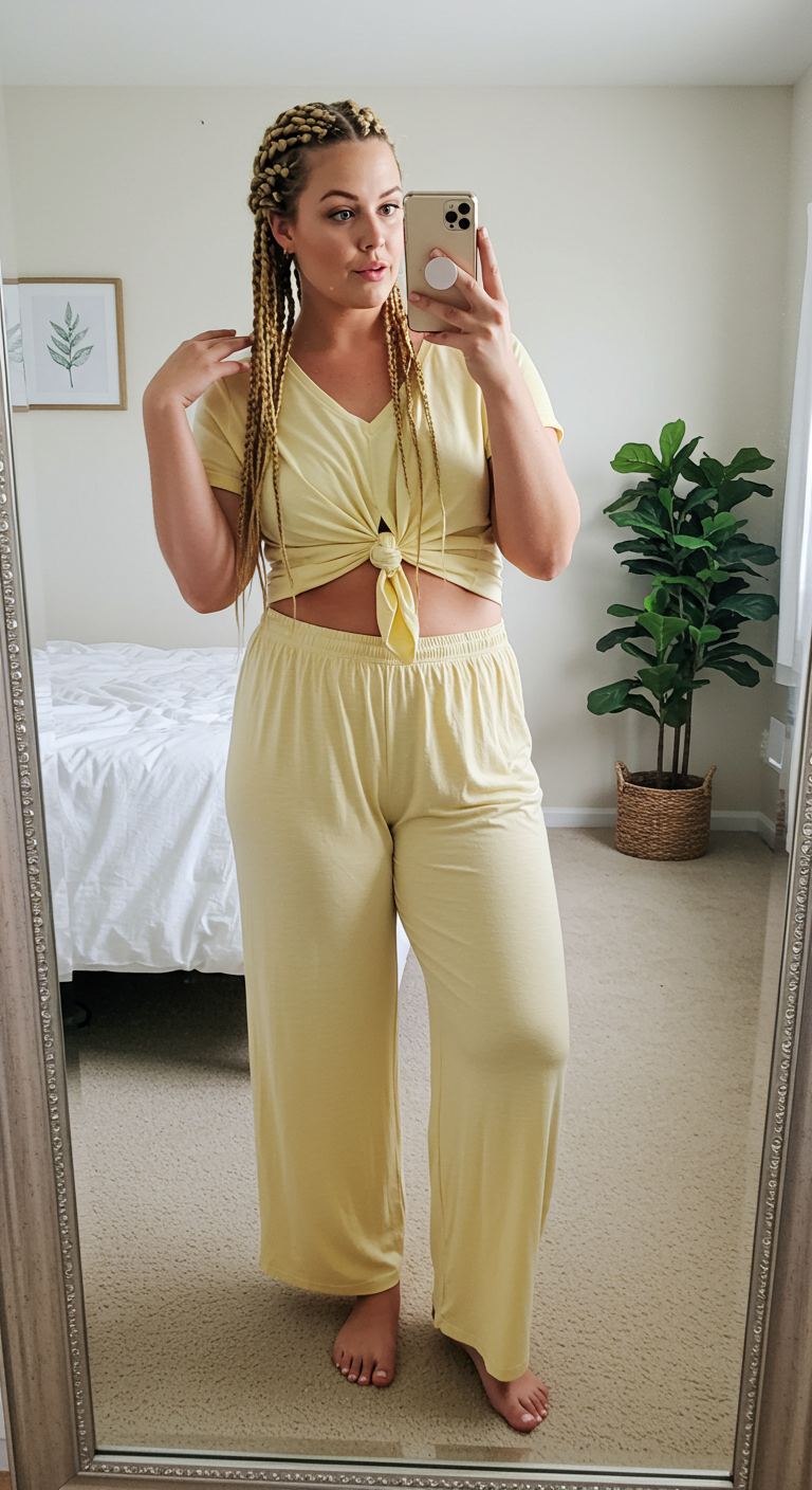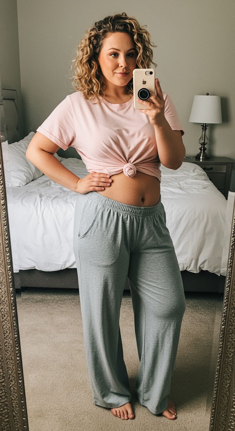 The soft blush pink tee, knotted at the waist, pairs effortlessly with the loose-fitting grey lounge pants, creating a balanced silhouette that prioritizes comfort. This combination of muted tones offers a serene aesthetic, ideal for a relaxed day at home or casual errands. The wide-leg pants provide ease of movement, while the knotted top adds a touch of subtle shaping without sacrificing comfort. It’s a versatile look perfect for individuals seeking both coziness and understated style.