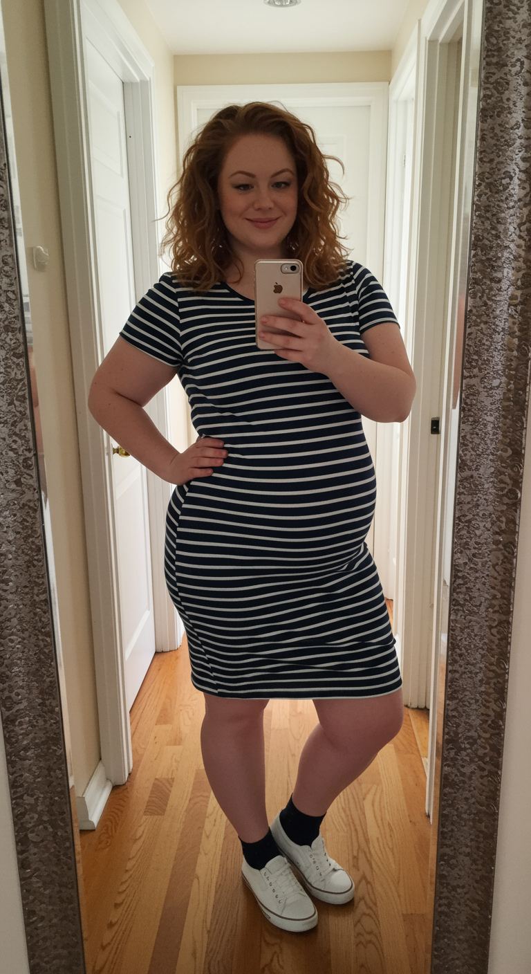 The navy and white striped knit dress offers a comfortable yet stylish foundation, perfectly balancing ease with a defined silhouette. Its classic horizontal stripes create visual interest, while the short sleeves and knee-length cut provide a versatile, relaxed fit. This ensemble, ideal for casual outings or weekend errands, complements various body types by skimming the figure without being overtly tight. Paired with crisp white sneakers and dark ankle socks, it achieves an effortlessly laid-back aesthetic suitable for those who appreciate understated comfort with a touch of timeless appeal.