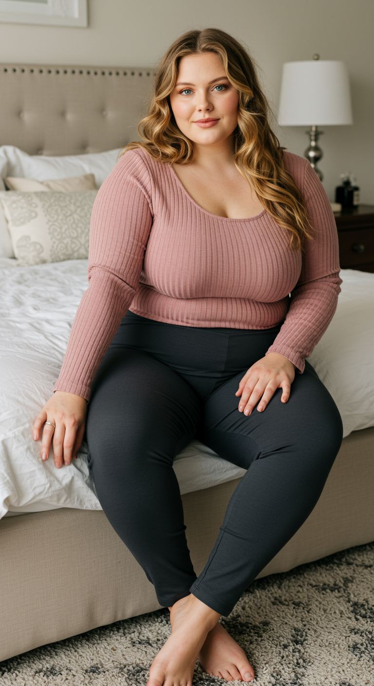 Inspired by the ease of contemporary loungewear, this ensemble perfectly balances comfort with understated style. The ribbed long-sleeve top in a soft dusty rose offers a flattering texture and gentle scoop neckline, complementing a range of bust sizes. Paired with sleek charcoal leggings, the outfit creates a cohesive and relaxed silhouette that is ideal for casual home settings, running errands, or a relaxed weekend brunch. This versatile pairing would suit individuals who prioritize comfort without compromising on a polished, effortless aesthetic.