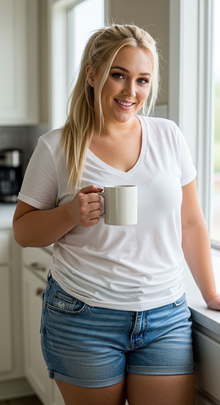 Perfect for warm weather, this ensemble offers a relaxed yet put-together feel for casual outings. The crisp white V-neck t-shirt provides a clean, versatile foundation, while the light wash denim shorts with a cuffed hem add a touch of playful ease. This relaxed fit is ideal for various body types, particularly those seeking comfort and a laid-back aesthetic, making it suitable for weekend errands, park visits, or a casual coffee date.
