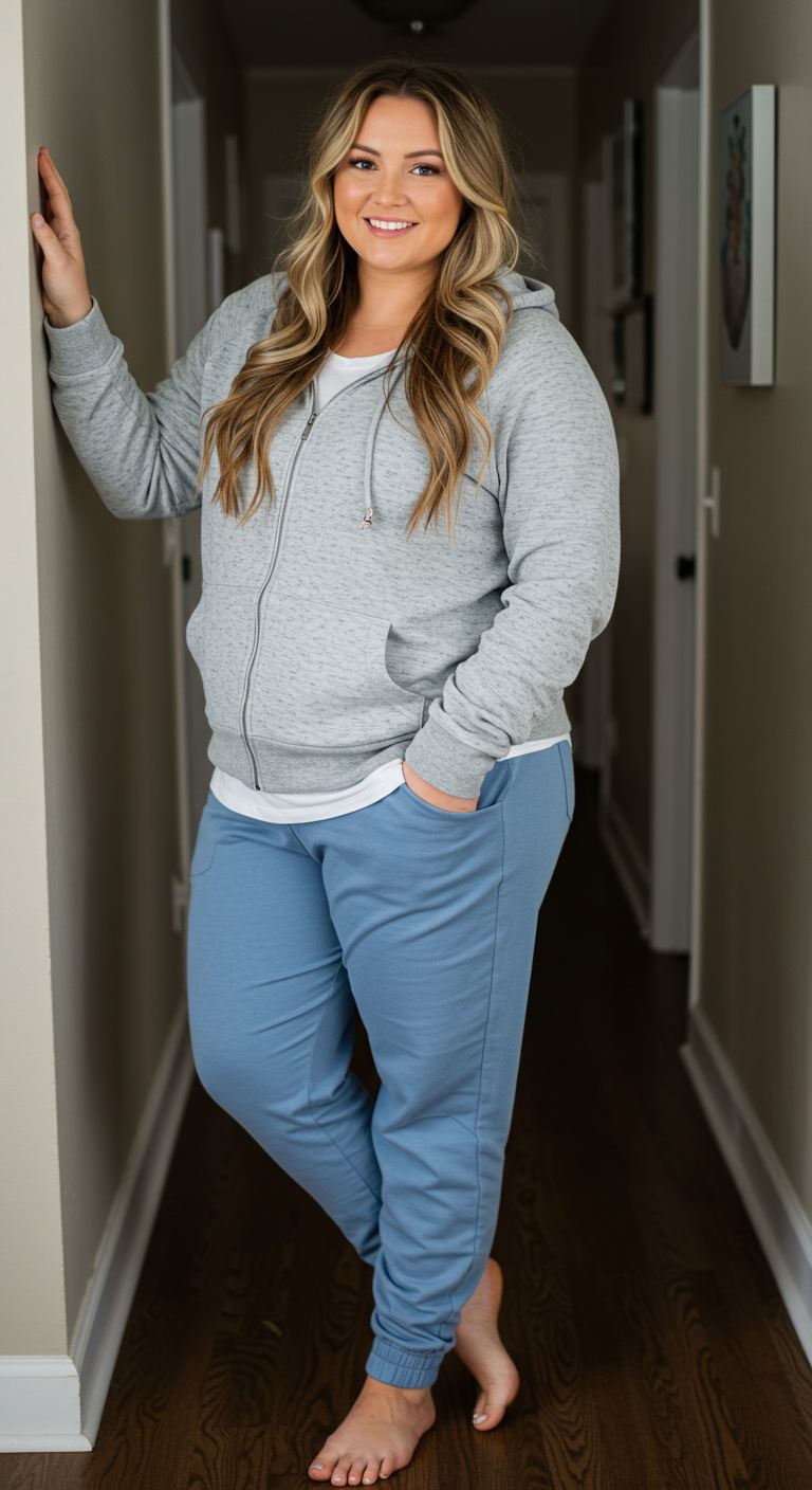 The distinctive soft azure joggers offer a refreshing pop of color, moving beyond standard neutrals often seen in casual wear. Paired with a classic heather grey zip-up hoodie and a crisp white tee, this ensemble strikes an ideal balance between laid-back ease and subtle style. This combination works well for various body types, particularly those who appreciate comfort without sacrificing a cohesive aesthetic. It’s perfectly suited for relaxed home days, casual errands, or low-key social gatherings.