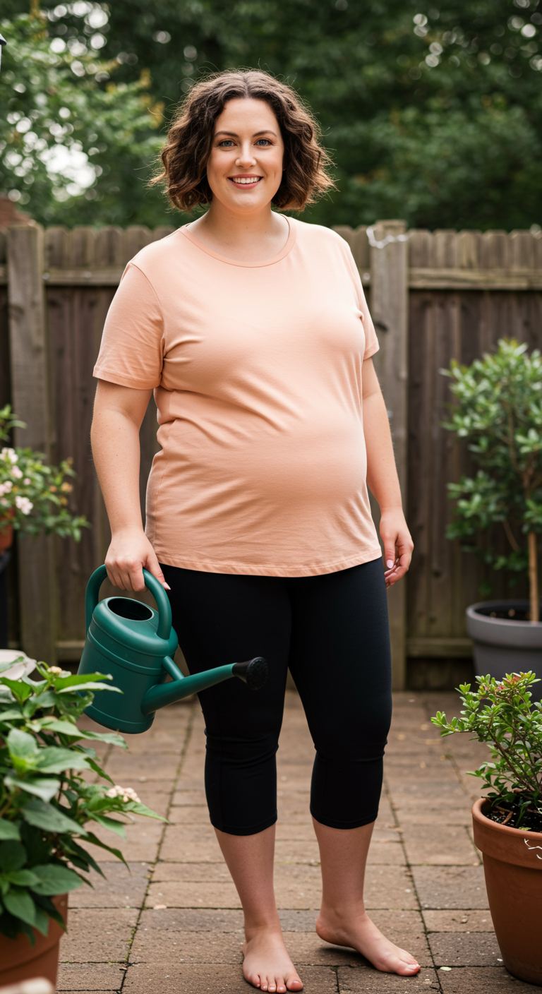 The art of comfortable dressing is mastered by combining a relaxed-fit tee with adaptable capri leggings. This simple yet effective pairing features a soft peach crew-neck t-shirt that drapes gently, offering ease of movement, complemented by cropped black leggings that provide a streamlined silhouette. The neutral color palette suits a wide range of personal styles and is particularly flattering for those seeking comfort without sacrificing a polished, casual aesthetic. This ensemble is ideal for daily errands, light activities, or relaxed home settings where ease is paramount.