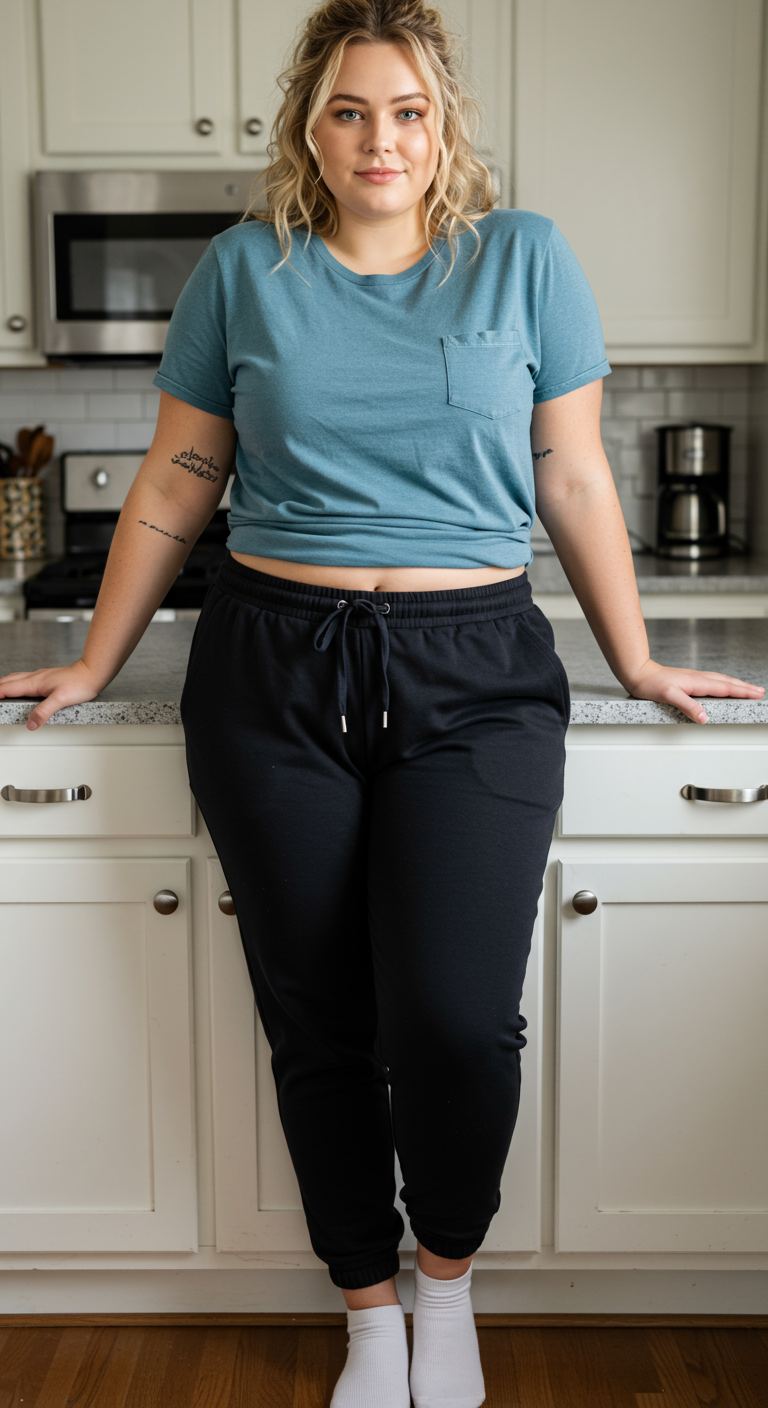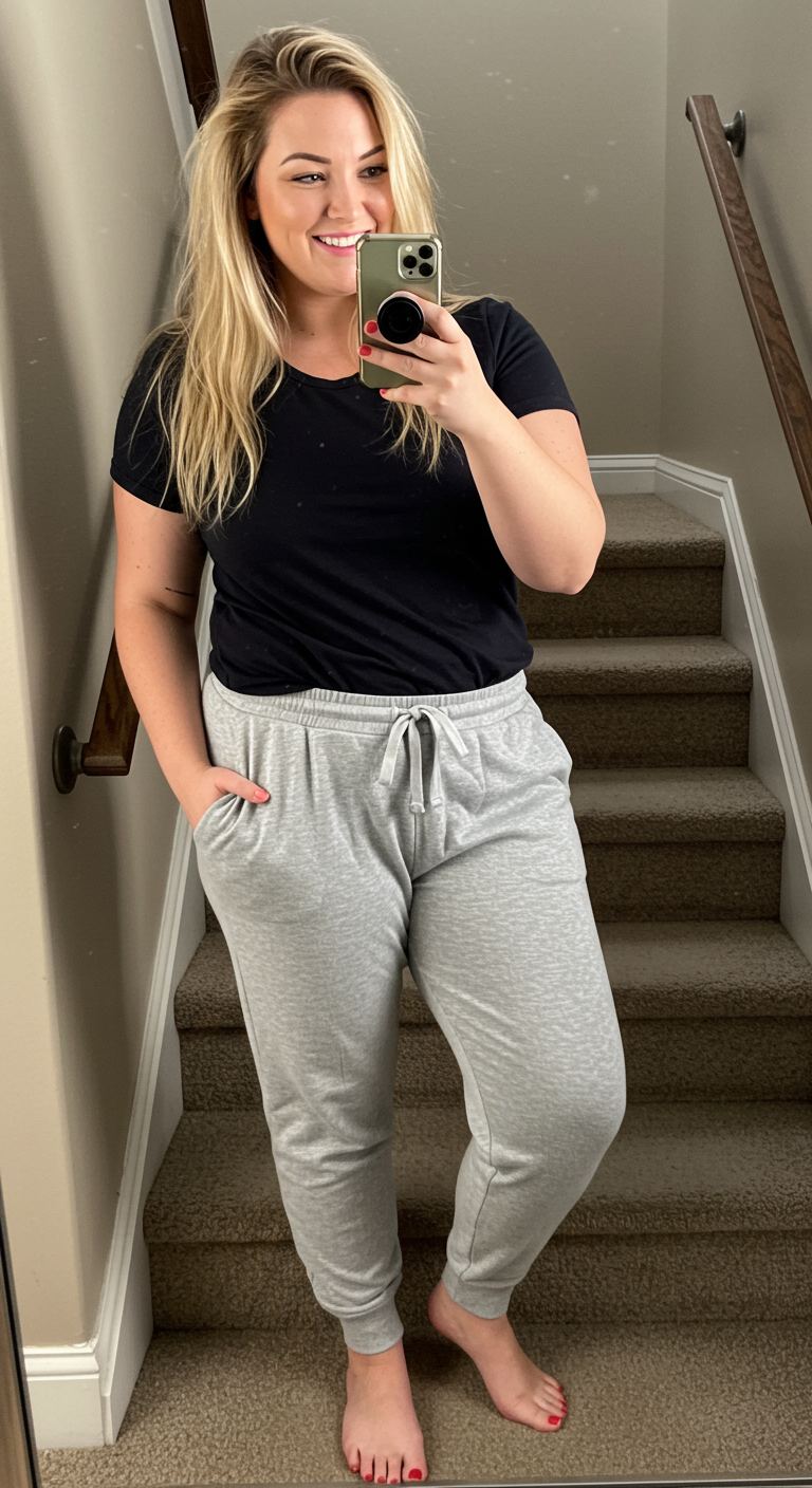 The epitome of casual comfort, this outfit offers an effortless and approachable vibe perfect for daily errands or lounging at home. A classic black crew-neck tee pairs seamlessly with soft grey drawstring joggers, creating a balanced and relaxed silhouette. This combination flatters most body types due to its forgiving fit and works well for those who prioritize ease without sacrificing a touch of understated style. It’s an ideal choice for low-key weekend activities or a cozy night in.