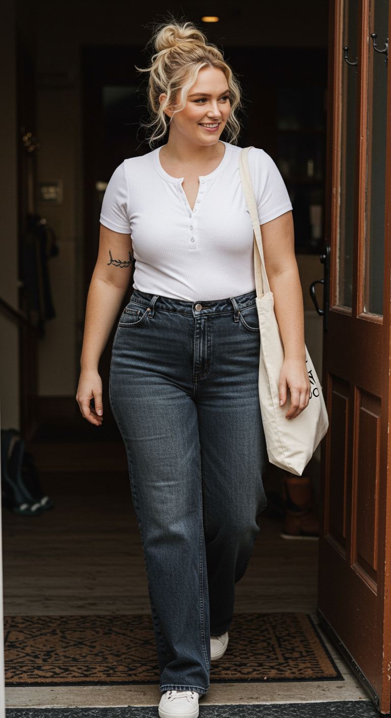 Exuding a relaxed yet polished vibe, this ensemble is perfect for those seeking comfort without compromising style. The ribbed white henley top, with its delicate button detailing, pairs seamlessly with the dark wash, wide-leg jeans, creating a balanced silhouette that flatters various body types, especially pear or hourglass figures. This versatile look is ideal for casual outings like running errands, meeting friends for coffee, or a relaxed weekend brunch. The combination of classic pieces ensures a timeless appeal for the modern, fashion-conscious woman.