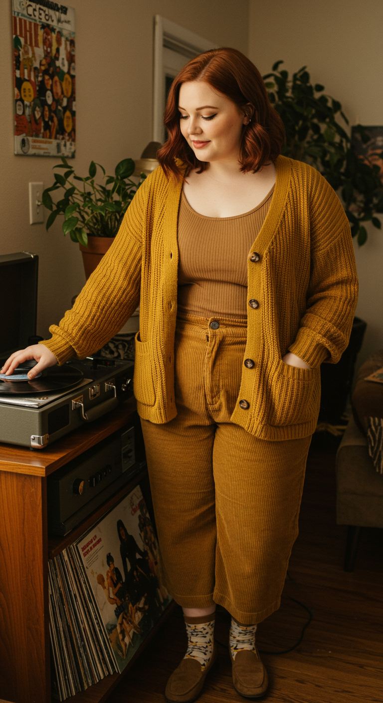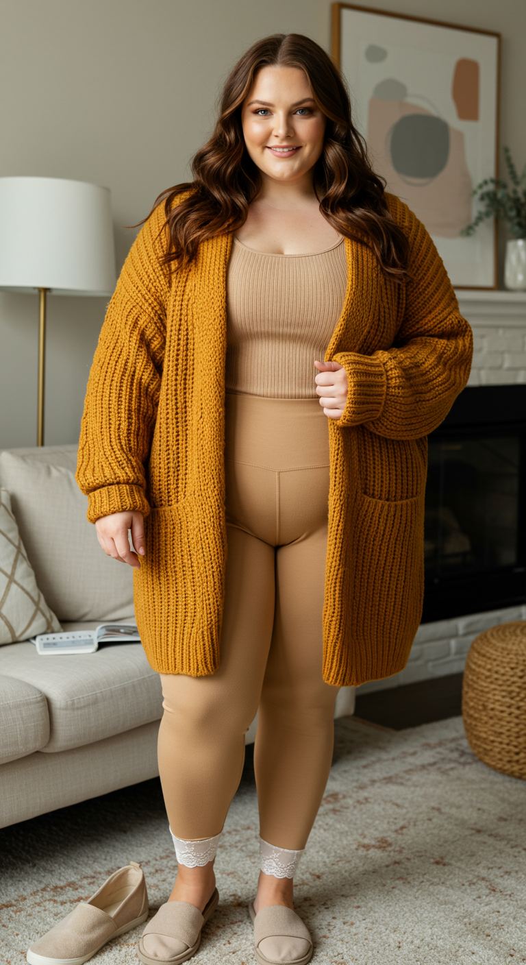 Drawing inspiration from cozy fall aesthetics, this ensemble centers on a rich, mustard-yellow chunky knit cardigan providing both warmth and a vibrant pop of color. Underneath, a ribbed beige tank top and matching leggings create a streamlined, monochromatic base that complements the relaxed outerwear. This versatile pairing works exceptionally well for pear or apple body types, offering comfort without sacrificing style, ideal for casual gatherings or relaxed weekends at home.