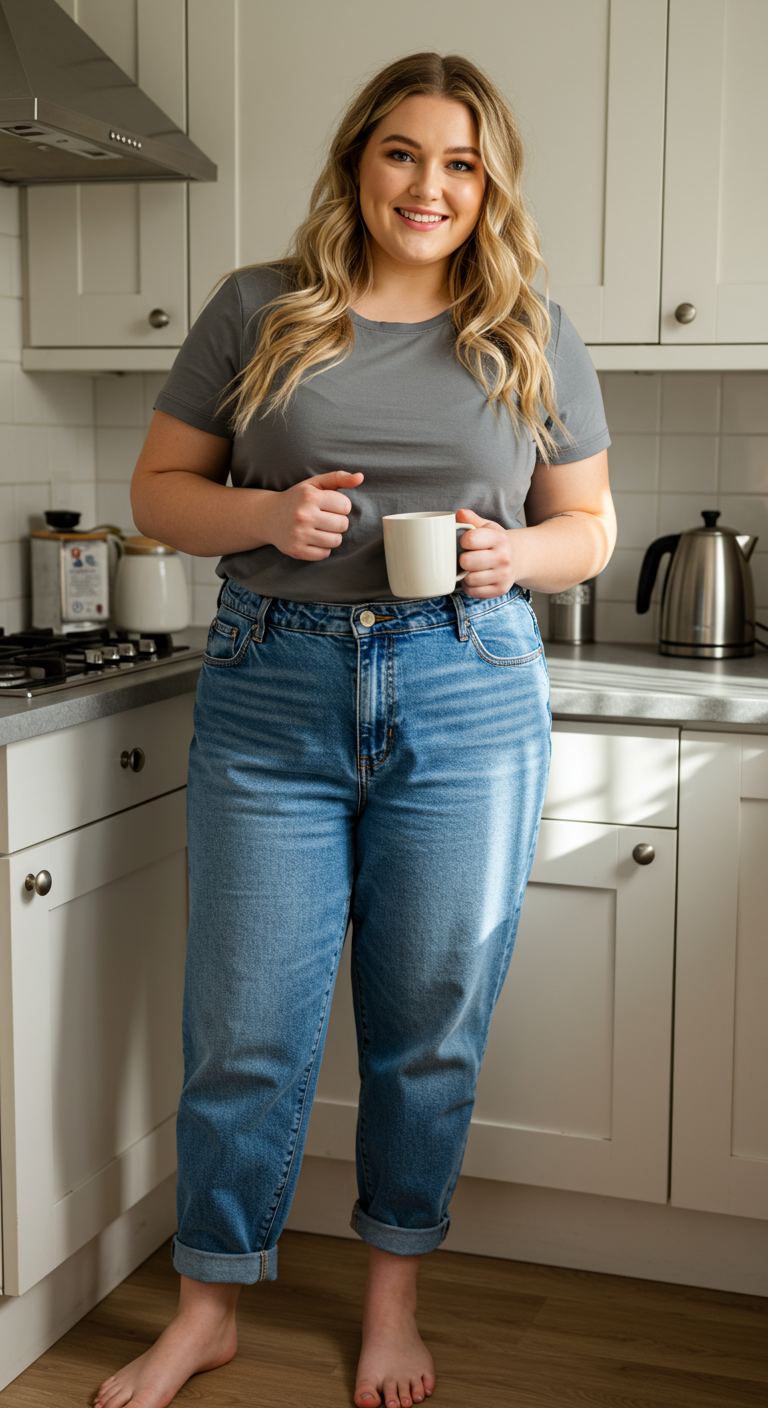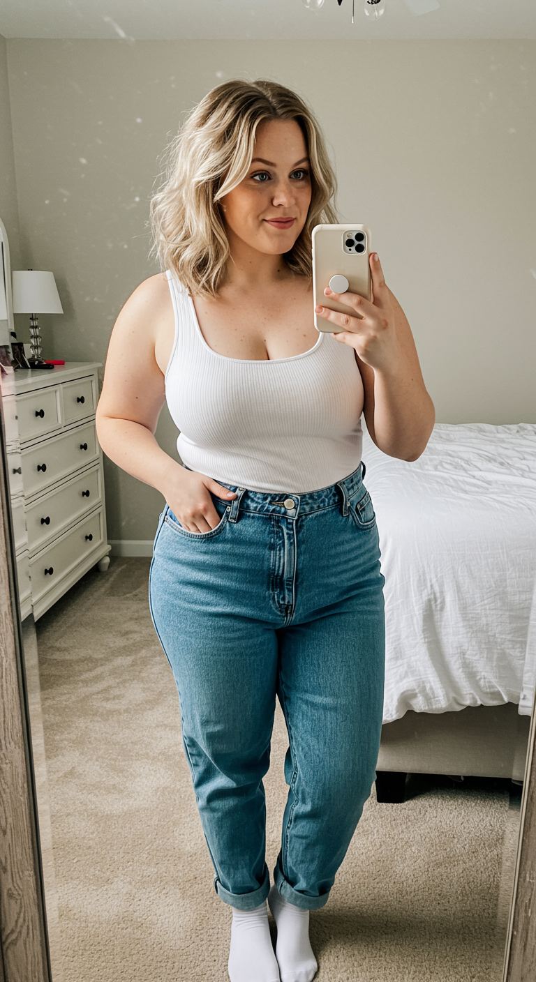 The simple front tuck of a soft grey tee into high-waisted, light-wash denim creates a casually chic silhouette. This pairing of a neutral top with relaxed-fit, cuffed jeans offers a comfortable yet polished aesthetic, perfect for an hourglass or pear body shape, highlighting the waist. The combination is ideal for relaxed weekend outings, casual brunches, or even a productive work-from-home day, embodying an understated personal style.