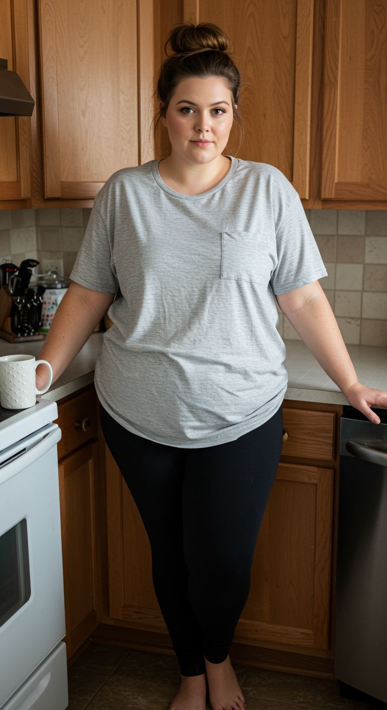 Inspired by the enduring appeal of casual, everyday ease, this ensemble focuses on foundational pieces that prioritize both comfort and a clean aesthetic. The soft grey tee, featuring a subtle chest pocket, pairs effortlessly with classic black leggings, creating a balanced and relaxed silhouette. This versatile combination is ideal for various body types, particularly those who appreciate a streamlined yet unrestrictive fit, and is perfect for casual outings, running errands, or simply enjoying a comfortable day at home.
