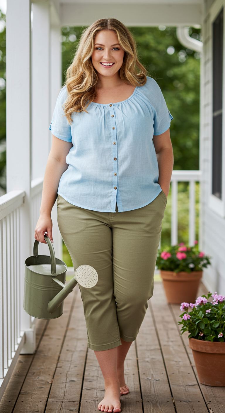 Perfect for warm weather, this ensemble combines comfort with casual elegance. A light blue linen-blend peasant top, featuring a soft scoop neck and button details, pairs effortlessly with olive green capri pants. This relaxed silhouette is ideal for an hourglass or pear body type, offering a flattering fit for leisurely outdoor activities or a casual garden party.