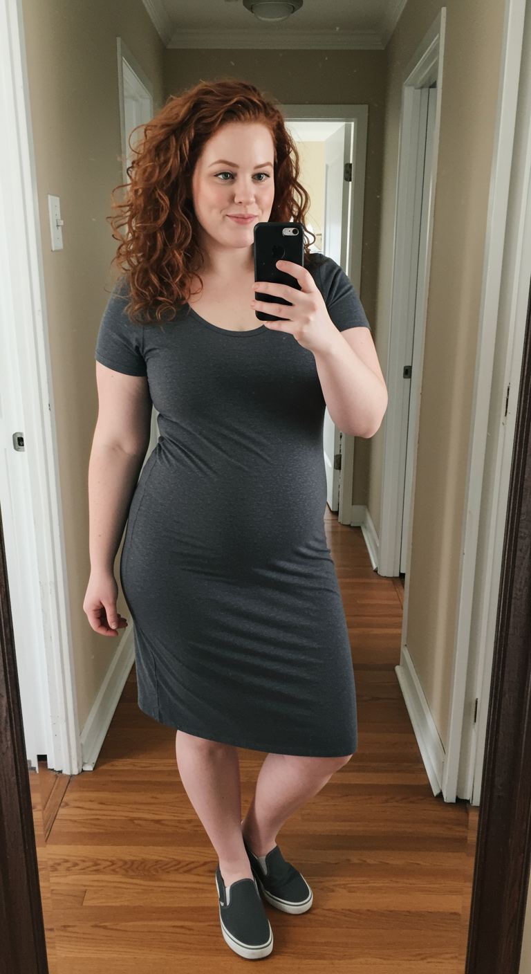 The unique appeal of this ensemble lies in its understated simplicity, blending comfort with a refined casual aesthetic. A form-fitting charcoal gray midi dress, crafted from a soft, stretch knit, offers a versatile foundation. Its gentle scoop neck and short sleeves create a relaxed silhouette that flatters various body types, particularly those with an hourglass or pear shape, by softly accentuating curves. Paired with dark slip-on sneakers featuring white soles, this outfit is ideal for relaxed weekend outings, casual errands, or an informal brunch where ease and style are equally prioritized.