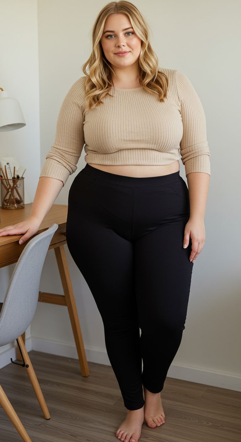The strategic pairing of a cropped, ribbed beige top with high-waisted black leggings creates a balanced silhouette, highlighting the natural waistline. The soft texture of the top offers a subtle contrast to the smooth leggings, ensuring both comfort and a polished aesthetic. This versatile ensemble is ideal for apple and hourglass body types, offering a flattering shape for casual outings, relaxed weekends, or even a comfortable work-from-home day.