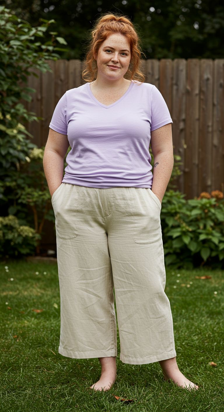 Perfect for a relaxed weekend or a casual outdoor gathering, this ensemble prioritizes ease without sacrificing style. The soft lavender V-neck tee offers a gentle color contrast against the wide-leg, cropped linen trousers in a muted beige, creating an approachable and balanced look. This comfortable pairing is ideal for those who favor a relaxed fit and natural textures, particularly complementing pear and apple body types with its flowing silhouette. The combination is a testament to understated elegance, suitable for garden parties, park strolls, or simply enjoying a leisurely day at home.