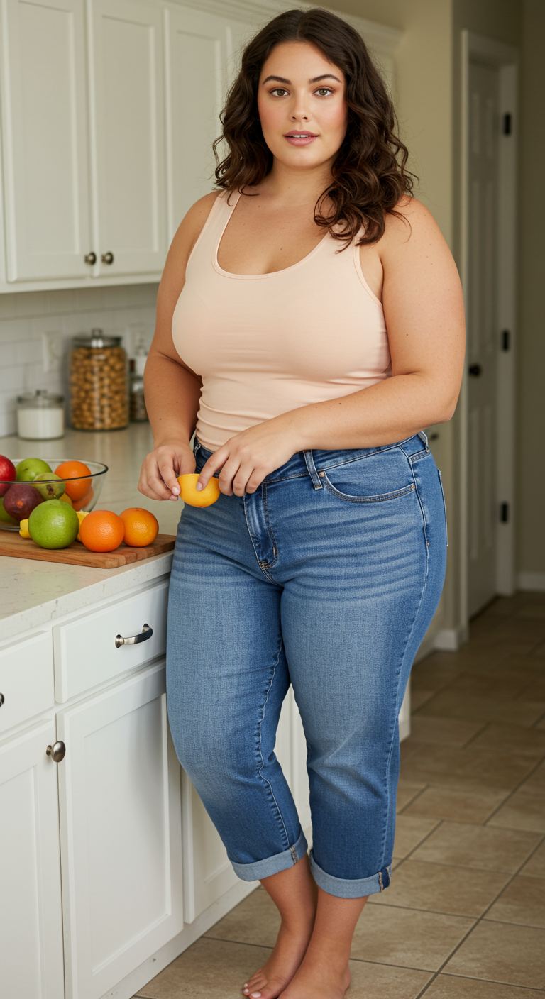 The serene color story of soft peach and classic medium-wash denim creates a foundation for relaxed style. A fitted tank top in a delicate peachy hue pairs seamlessly with cuffed capri jeans, offering a comfortable yet chic silhouette. This combination is ideal for a casual day out or running errands, flattering various body types with its balanced proportions. The simplicity of the ensemble allows for effortless versatility, easily elevated with accessories or kept understated for maximum ease.