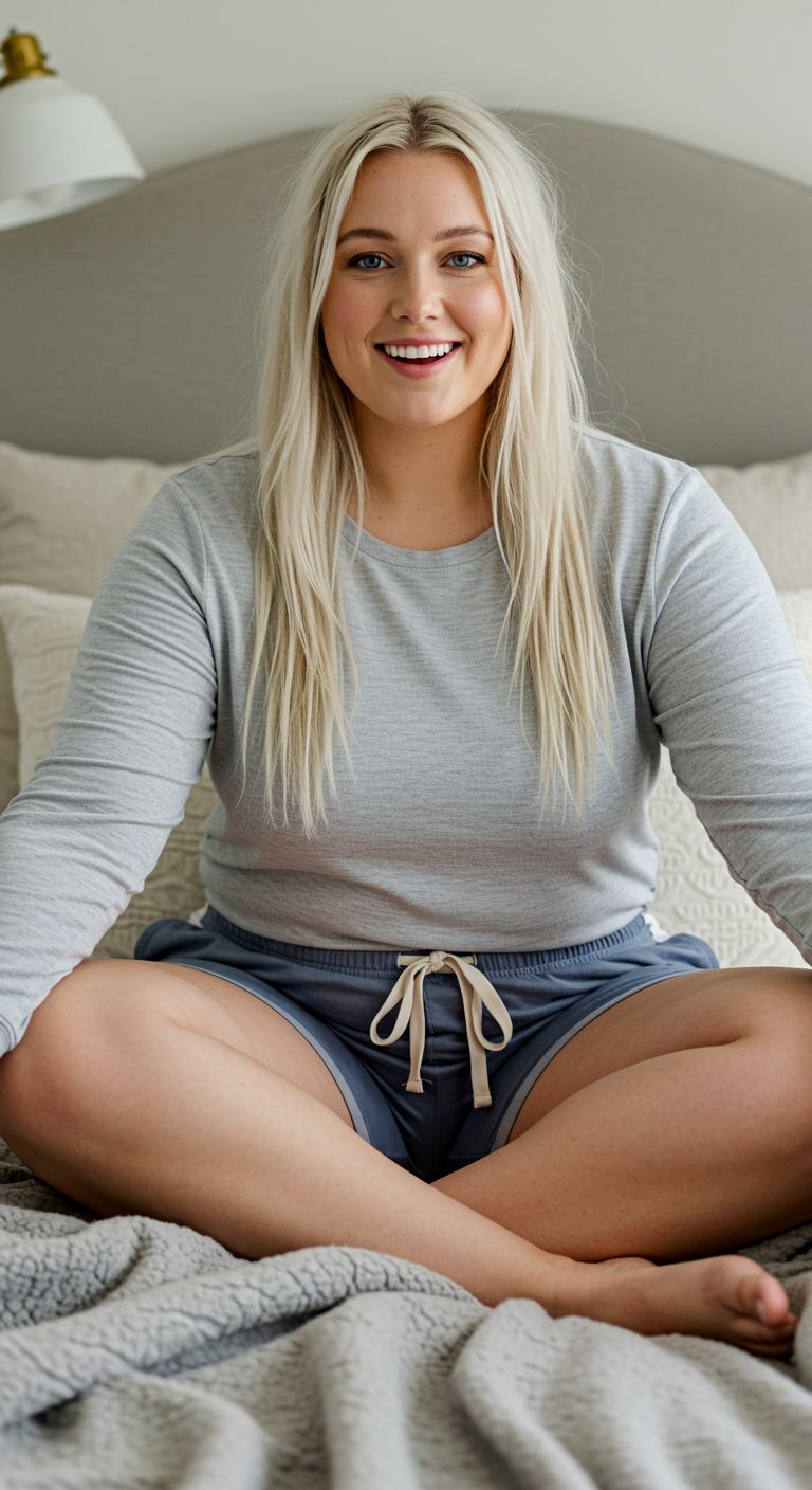 Exuding an effortless sense of ease, this ensemble is perfect for unwinding at home. The soft grey long-sleeve top paired with relaxed blue shorts, featuring a contrasting light drawstring, creates a harmonious and comfortable aesthetic. This casual pairing flatters a variety of body types, offering unrestricted movement and a gentle silhouette. Ideal for leisurely mornings, working from home, or cozy evenings, it perfectly blends comfort with understated style.