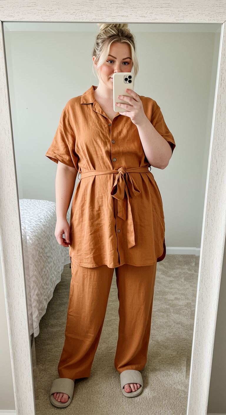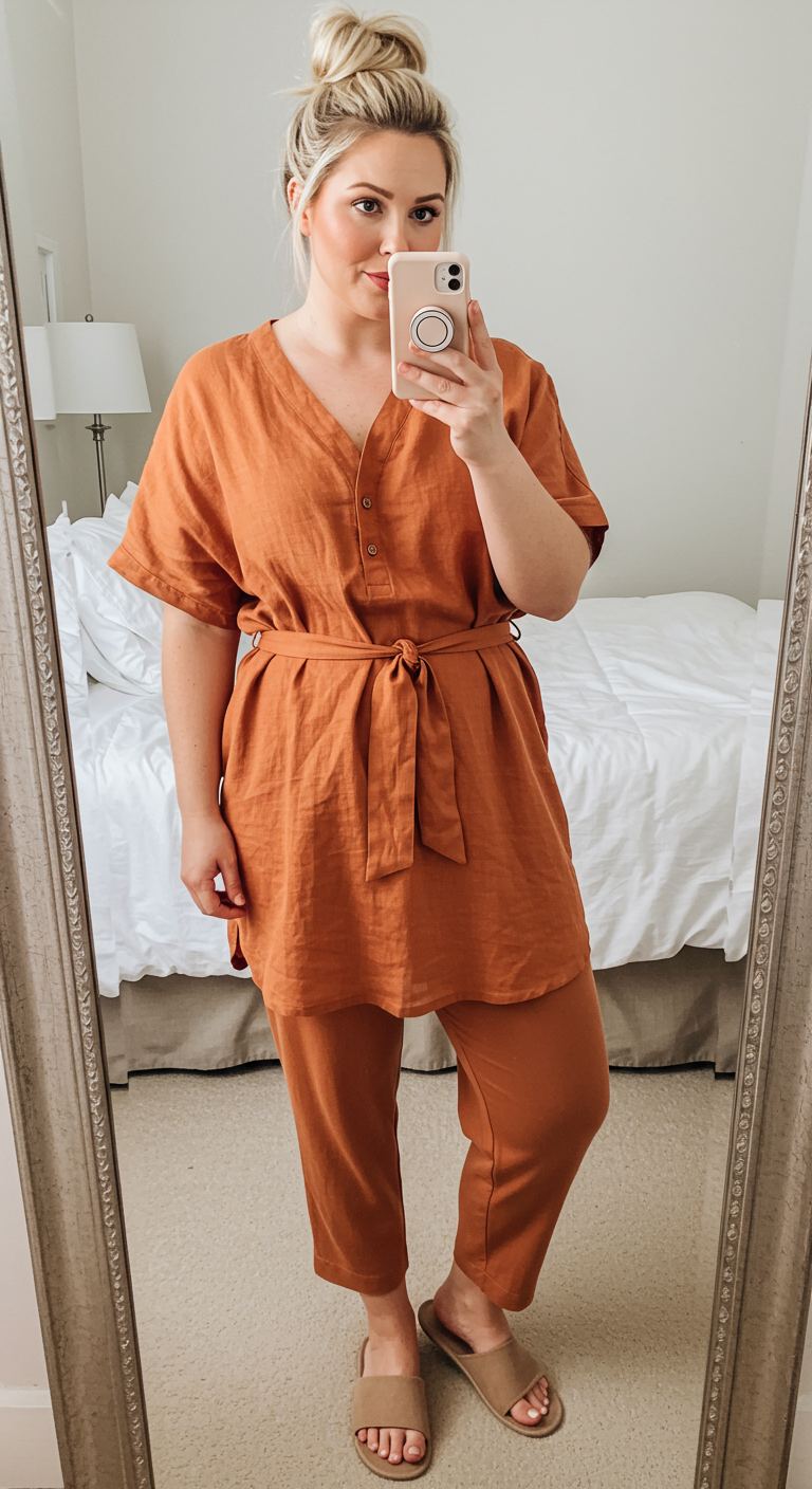 The warm terracotta hue of this relaxed two-piece ensemble immediately draws the eye, offering a sophisticated take on casual wear. The tunic top, cinched at the waist with a self-tie belt, creates a flattering silhouette while the coordinating cropped pants ensure a comfortable yet polished aesthetic. This outfit is ideal for those who appreciate understated elegance and can effortlessly transition from a relaxed brunch to a casual evening gathering. The breathable linen-blend fabric and monochrome styling make it a versatile choice for various body types and personal styles, particularly those favoring comfort without compromising on chic appeal.