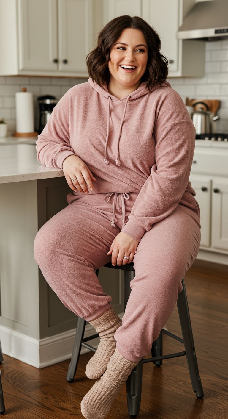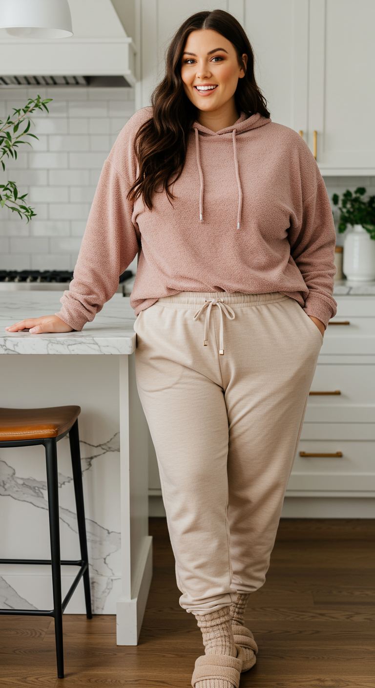 The textured blush pink hoodie immediately draws the eye, offering a soft, inviting feel. Paired with light beige drawstring joggers, this creates a monochromatic yet dynamic casual ensemble perfect for relaxing at home or running quick errands. This comfortable combination, especially with its relaxed fit, flatters most body types and is ideal for those who prioritize ease without sacrificing style. The outfit’s gentle hues and plush textures make it suitable for a cozy weekend or a laid-back evening.