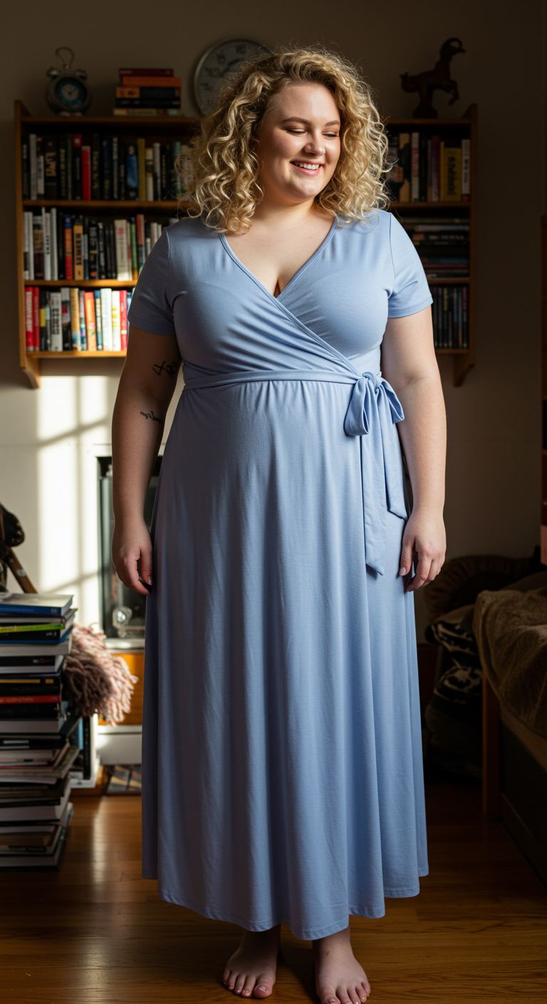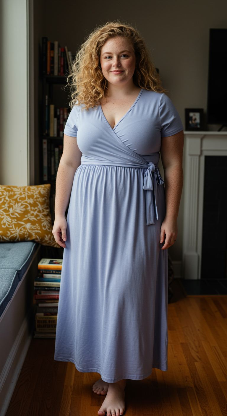 The inherent versatility of a soft, flowing maxi dress in a serene sky blue hue makes this look truly unique. Its classic wrap silhouette, complete with a flattering V-neckline and a cinched waist tie, accentuates the figure beautifully, offering comfort without sacrificing style. This design is exceptionally suited for various body types, particularly those seeking to highlight their décolletage and waist, while the fluid skirt provides graceful movement. Ideal for relaxed daytime outings, casual brunches, or even a comfortable work-from-home ensemble, this dress embodies an understated chic perfect for the modern woman who values both ease and elegance.