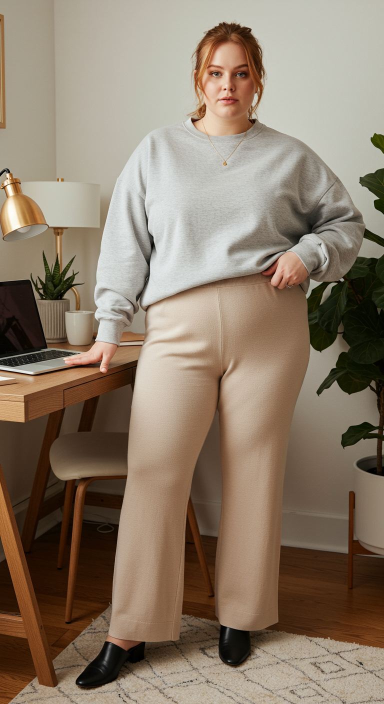 Styling an oversized grey sweatshirt by partially tucking it into high-waisted beige knit trousers creates a relaxed yet intentional silhouette. The soft, monochromatic neutral palette of light grey and warm beige offers a comfortable elegance, suitable for various body types seeking both comfort and refined style. This combination, finished with sleek black mules, is ideal for a productive day working from home or a casual office environment where comfort is key.