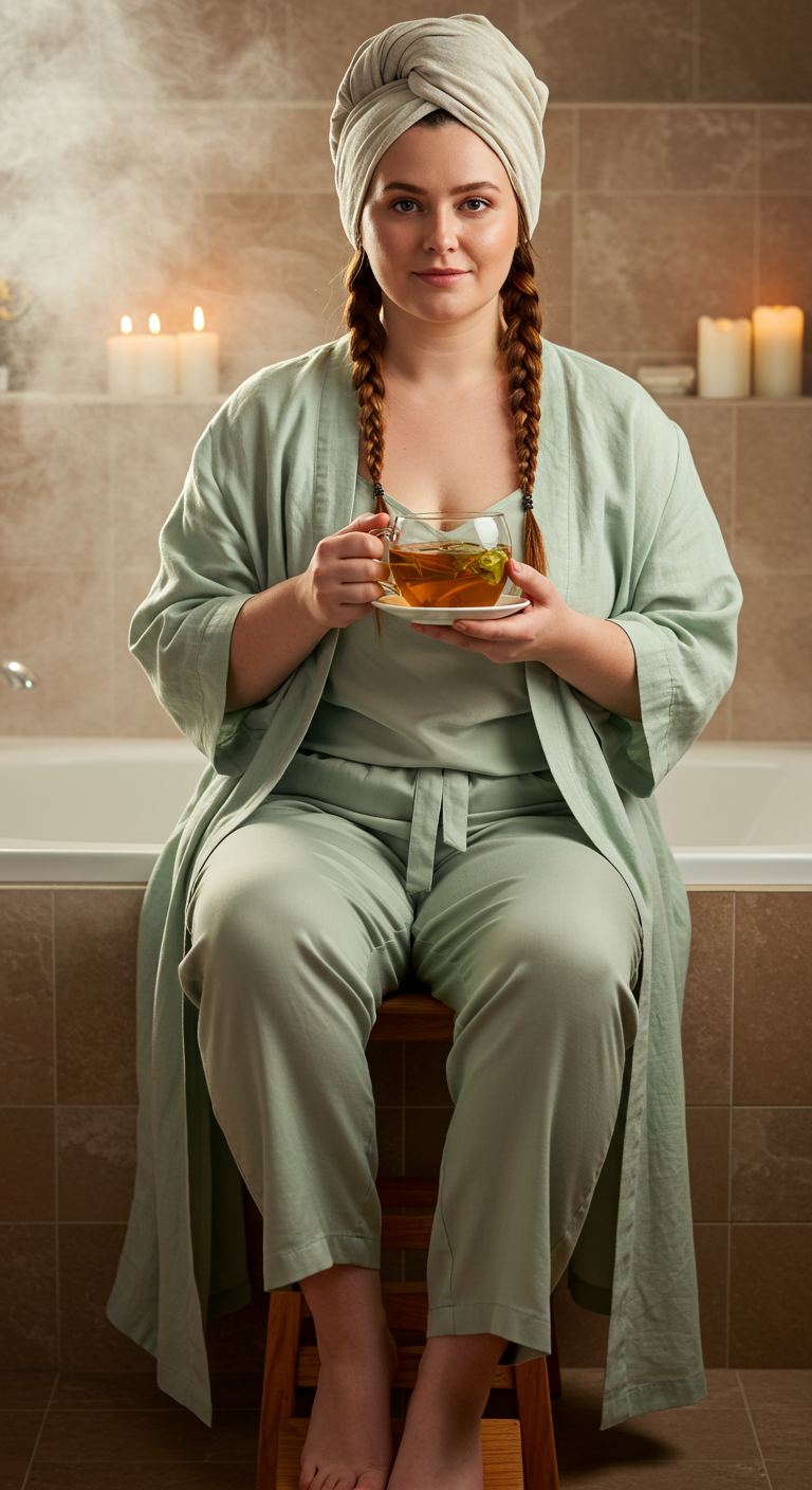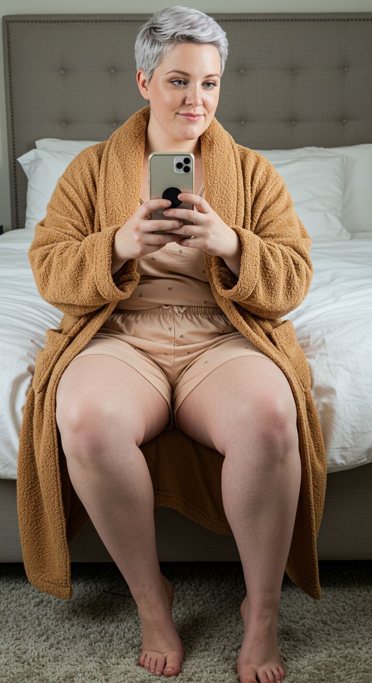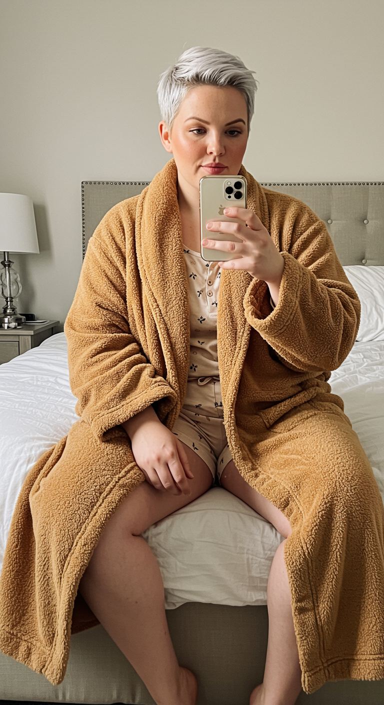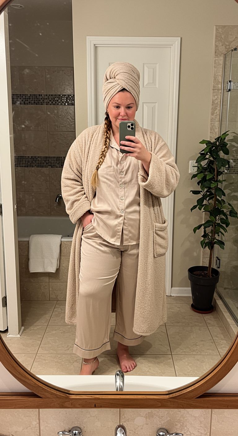 For those serene mornings at home, this outfit prioritizes ultimate comfort without sacrificing a touch of coordinated style. A plush, camel-toned robe provides luxurious warmth, draped over a soft, light-colored pajama set featuring a subtle, delicate print. This relaxed yet put-together combination is ideal for anyone seeking comfortable loungewear, perfectly complementing various body types with its forgiving silhouette, and is best suited for cozy indoor settings like reading a book or enjoying a slow start to the day.