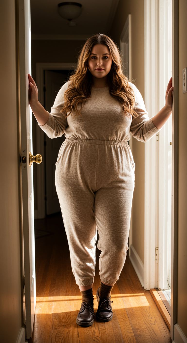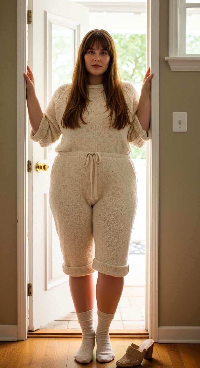 A harmonious blend of oat and soft beige creates a monochromatic moment that exudes comfort and understated elegance. The textured knit jumpsuit, featuring an elasticized waist and tapered legs, offers a relaxed yet refined silhouette. This versatile piece is ideal for those who favor a minimalist aesthetic or seek effortless style for casual outings, relaxed gatherings, or even remote work. Paired with dark brown lace-up shoes and ribbed socks, the ensemble achieves a balanced, approachable sophistication that complements various body types seeking comfortable fashion.
