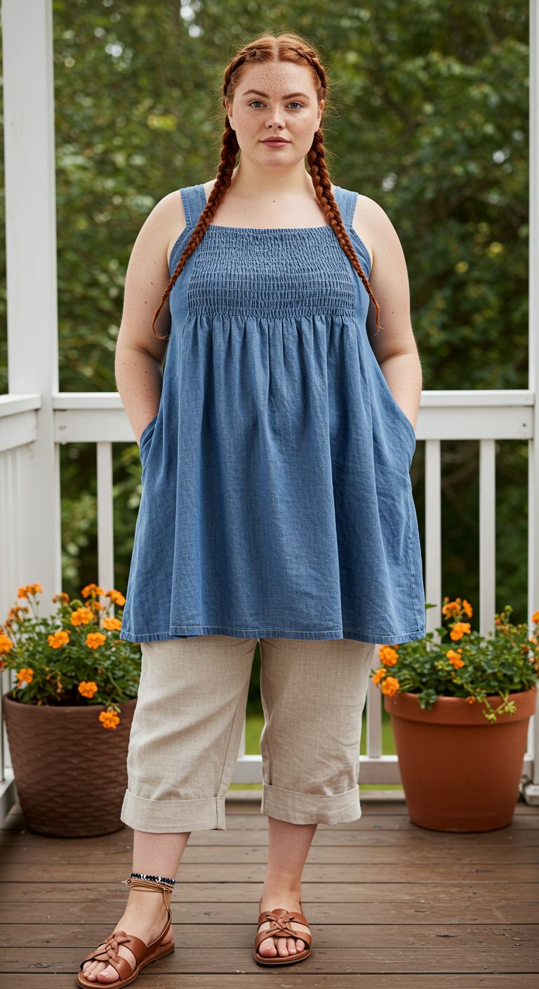 A sense of effortless ease defines this warm-weather ensemble, perfect for a casual day out. The light blue smocked tunic, offering a comfortable, flowing silhouette, pairs beautifully with the natural linen capri pants, creating a breathable and stylish contrast. This outfit is ideal for those who favor comfort without sacrificing chic, complementing various body types with its relaxed fit. Accessorized with simple flat sandals, it’s a perfect choice for leisurely strolls or outdoor gatherings.