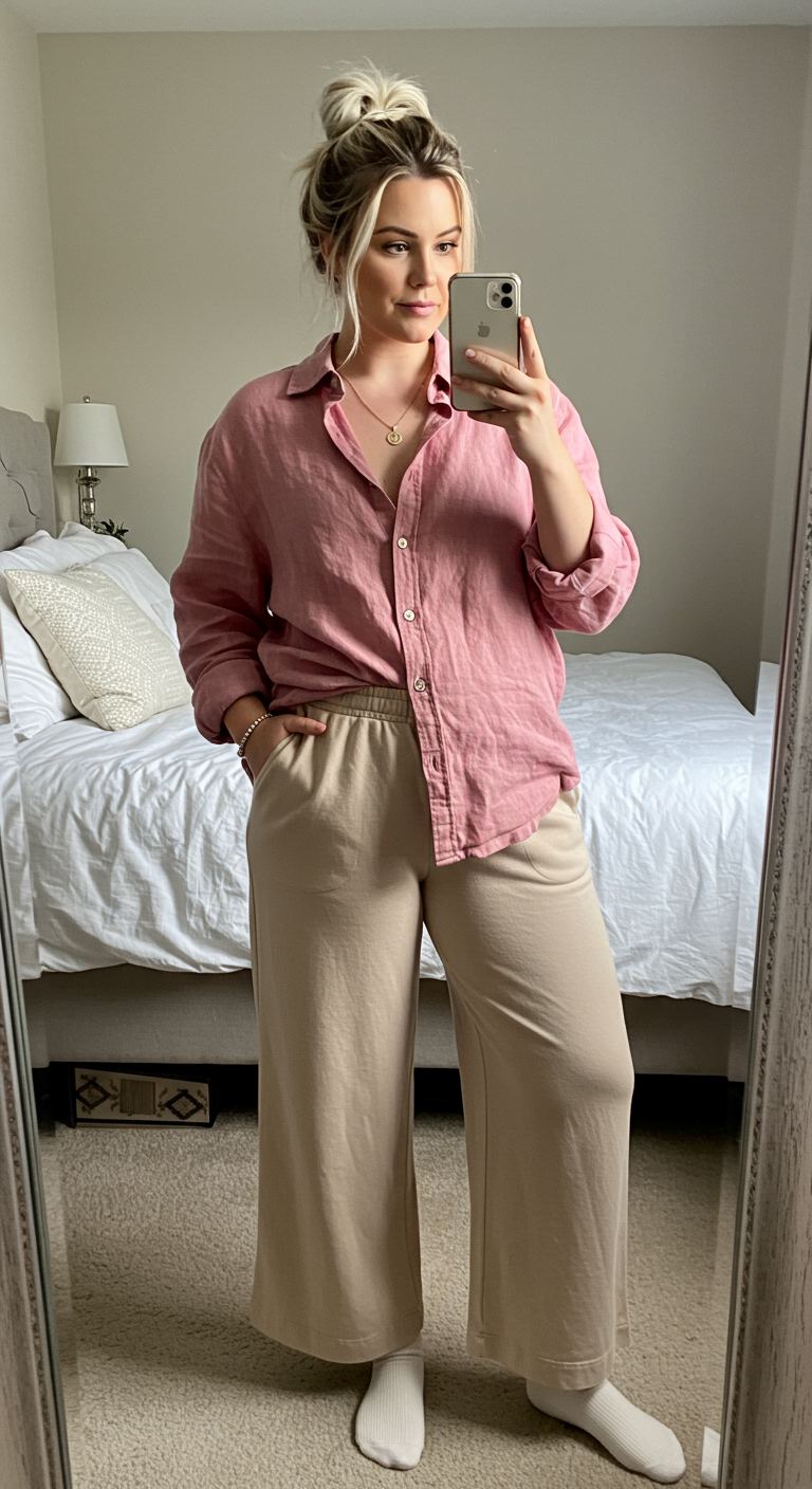The standout piece in this casual yet polished ensemble is the dusty rose linen button-down, offering a touch of sophisticated color and texture. Its relaxed fit pairs effortlessly with wide-leg beige trousers, creating a comfortable silhouette that flatters many body types, particularly those seeking an unrestrictive yet chic aesthetic. This combination is perfect for a relaxed weekend outing, a casual brunch, or even a work-from-home day where comfort meets subtle style. The neutral tones allow for versatile accessory choices, making it a highly adaptable look for the modern woman.