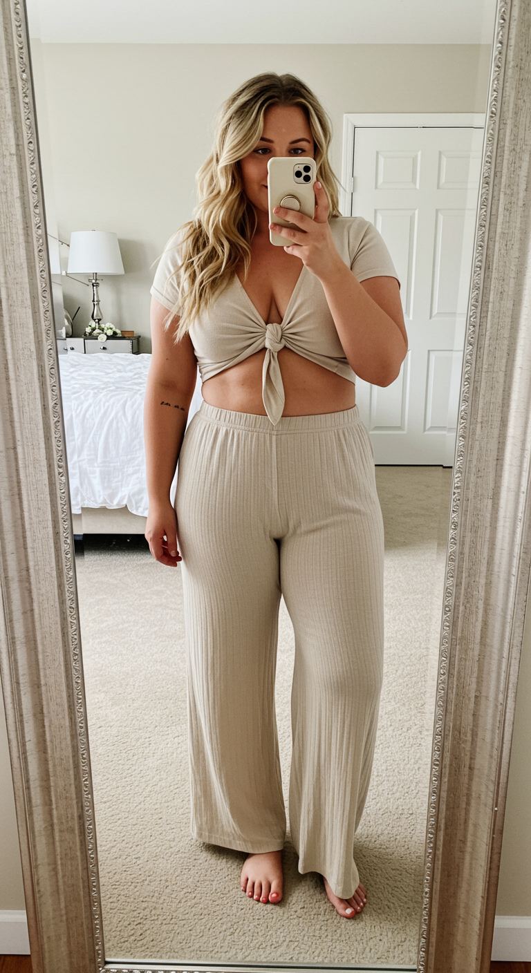 The soft, ribbed knit fabric of both the tied crop top and wide-leg trousers creates a cohesive and effortlessly comfortable two-piece ensemble. This light beige set offers a relaxed yet put-together aesthetic, ideal for those who favor comfort without compromising on style. The top’s tie-front detail adds a touch of playful allure, while the flowing pants provide a flattering silhouette suitable for various body types. Perfect for casual outings, relaxed weekends, or cozy evenings at home, this outfit embodies a chic, laid-back vibe.