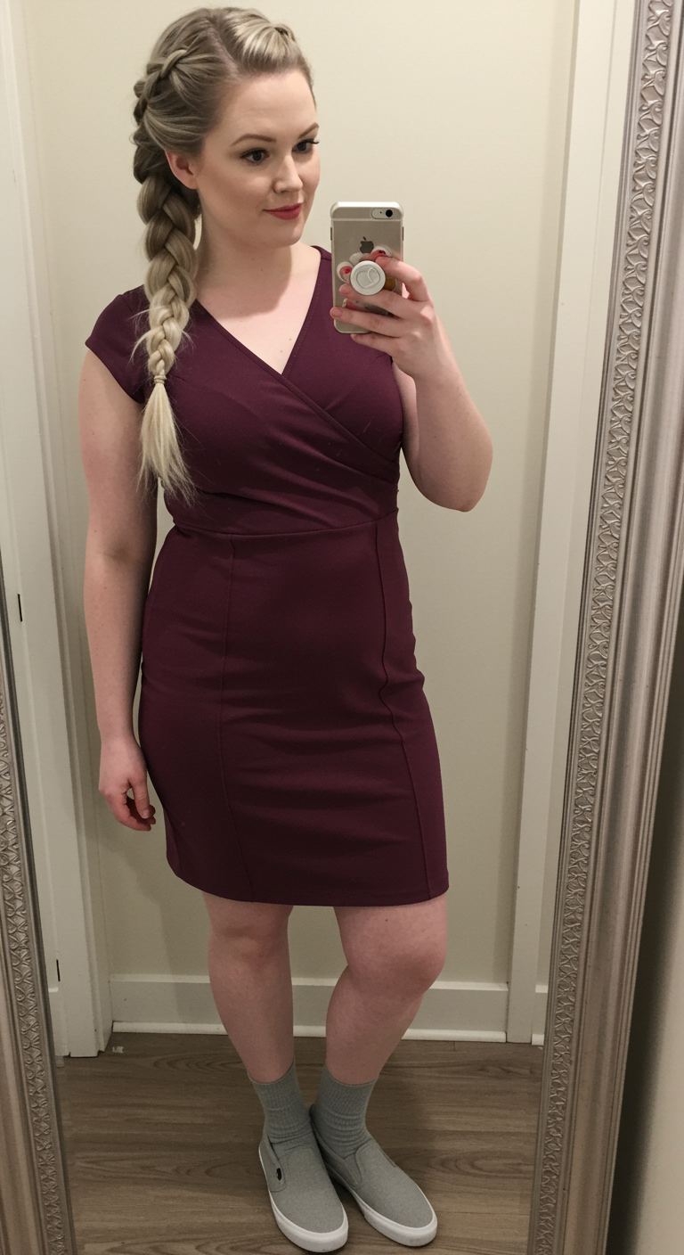 Perfect for cooler transitional weather, this rich berry-hued wrap dress offers a flattering silhouette for many body types, particularly those with an hourglass or pear shape, accentuating the waist. The deep V-neckline and cap sleeves add a touch of sophistication, making it suitable for a casual office environment or a relaxed weekend outing. Paired with comfortable slip-on sneakers and socks, it strikes a balance between effortless style and practical comfort.