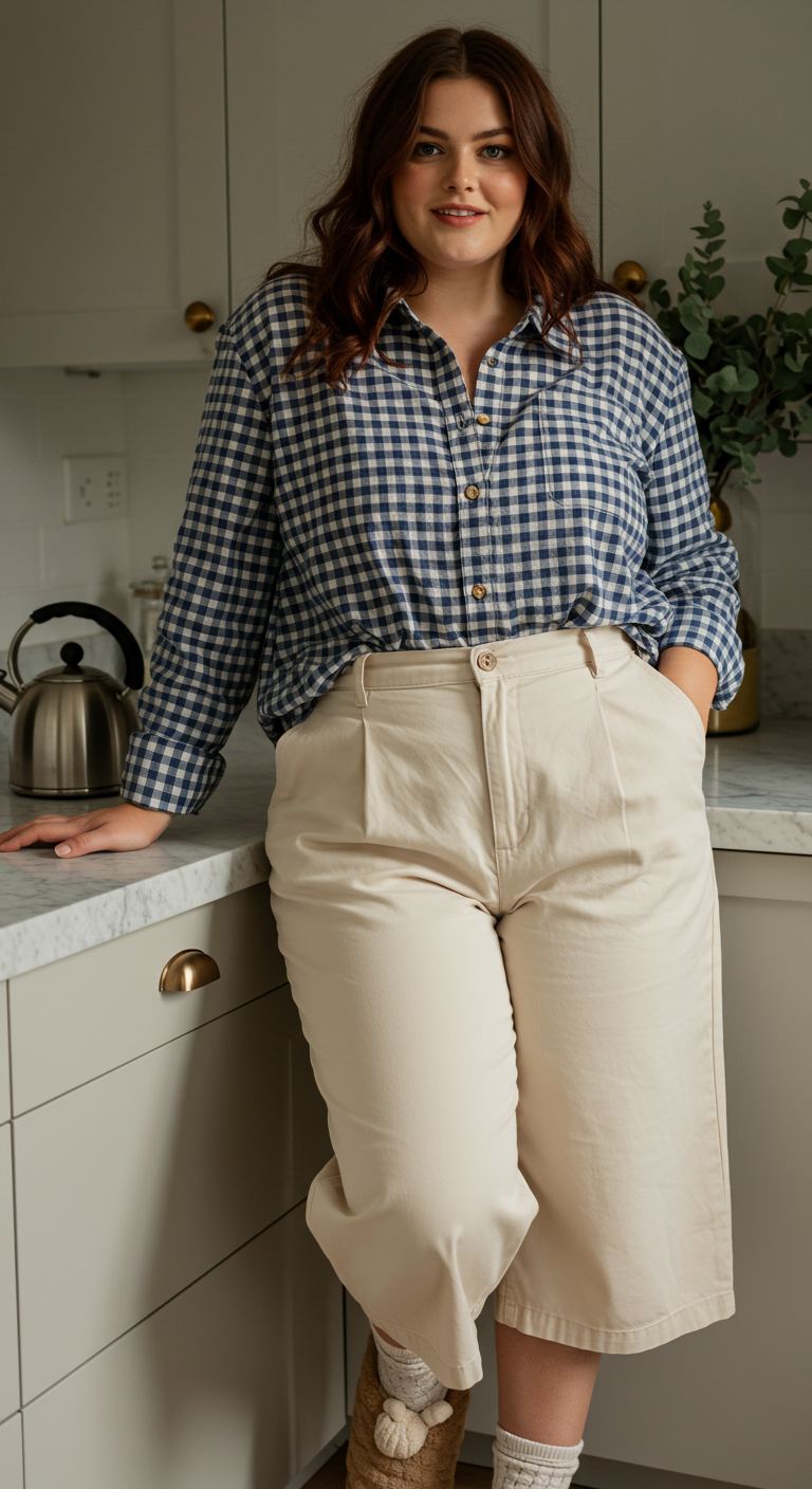 The crisp texture of the blue and white gingham shirt offers a delightful contrast to the soft, flowing khaki culottes, creating an effortlessly chic and comfortable ensemble. This relaxed fit is ideal for various body types, particularly those seeking a balanced silhouette that emphasizes ease of movement. The high-waisted culottes, tucked-in shirt, and neutral palette make it suitable for casual outings, weekend errands, or even a relaxed work-from-home day, embodying a smart yet laid-back aesthetic.