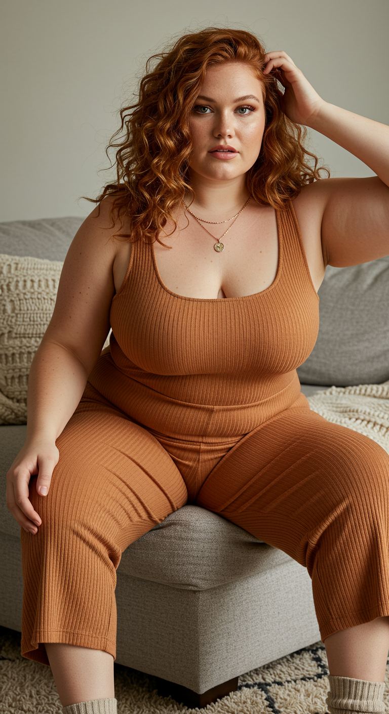 Monochromatic styling creates a cohesive and elongating effect in this ribbed knit ensemble. The rich terracotta hue, applied across both the tank top and wide-leg trousers, offers a warm, inviting aesthetic. This comfortable yet chic pairing is ideal for those who favor relaxed silhouettes and tactile textures, complementing various body types with its fluid drape. Perfect for casual weekend outings, cozy at-home lounging, or relaxed social gatherings, this outfit balances ease with understated sophistication.